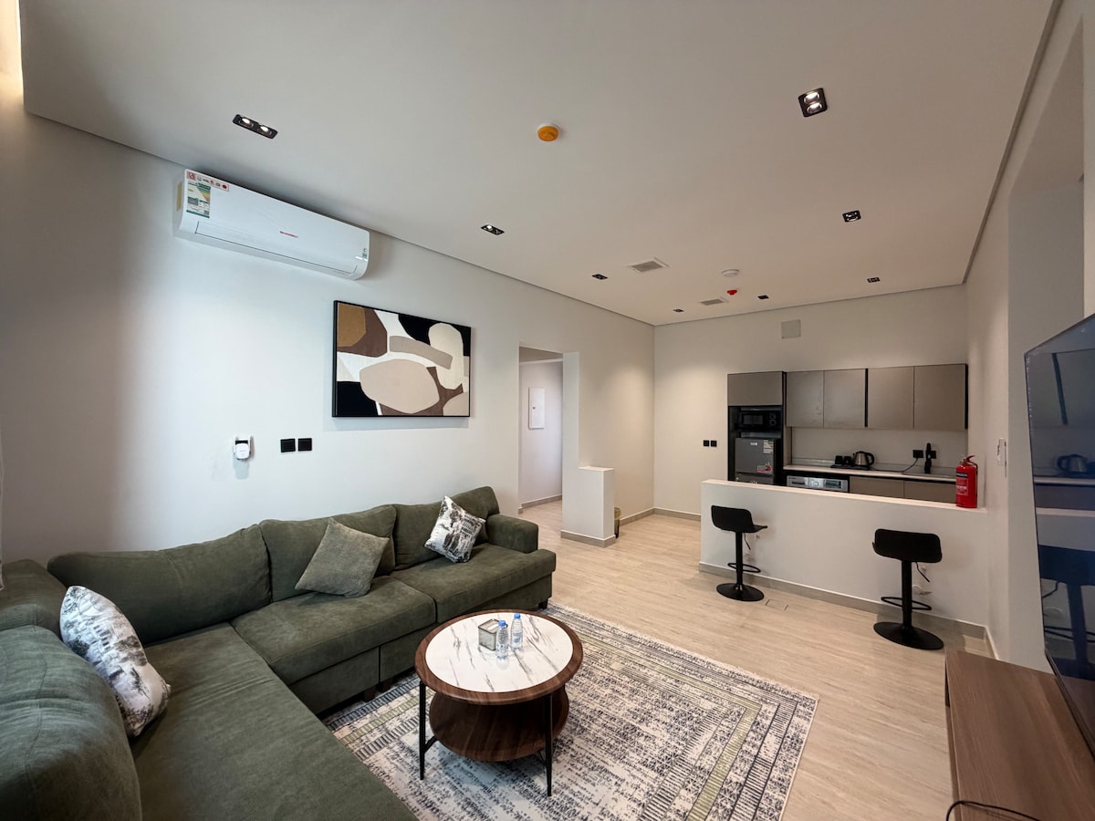 Descubra uma estadia única num apartamento acolhedor no coração de Khobar. O apartamento tem muitas comodidades: 1. Entrada inteligente e segura por fechadura inteligente. 2. Espaço de estar amplo e confortável para a família. 3. Uma grande cozinha integrada com utensílios de cozinha e utensílios. 4. Ecrã inteligente 4K. 5. Ligação rápida à Internet 5G. 6. Estacionamento privado. Além disso, o apartamento fica perto de muitas atrações, incluindo: 1. Ponte do Bahrein - A 5 minutos. 2. Al Rashed Mall - 10 min. 3. À beira-mar - 5 min.