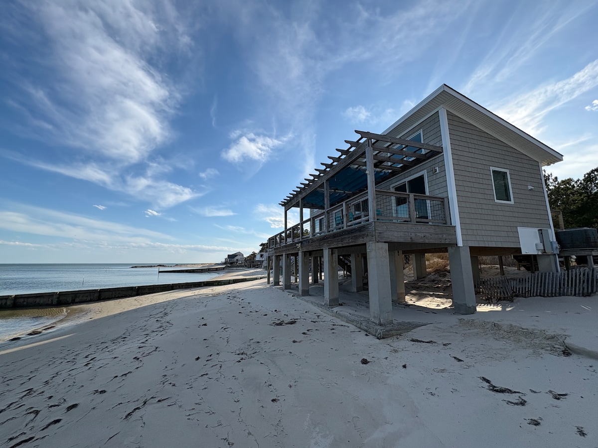 Um santuário, um oásis, uma experiência única em comunhão com a natureza enquanto relaxa em esplendor civilizado — todas são descrições adequadas desta casa de praia projetada por um arquiteto de Nova York nas margens da Baía de Chesapeake. Os hóspedes desfrutam de vistas deslumbrantes para a água a partir de uma altura de piso acabado de 11 metros. A costa leste da Virgínia é famosa por suas águas rasas, mas esta propriedade está situada entre dunas incomuns, com pinheiros, eucaliptos e vistas amplas do mar e do pôr do sol.