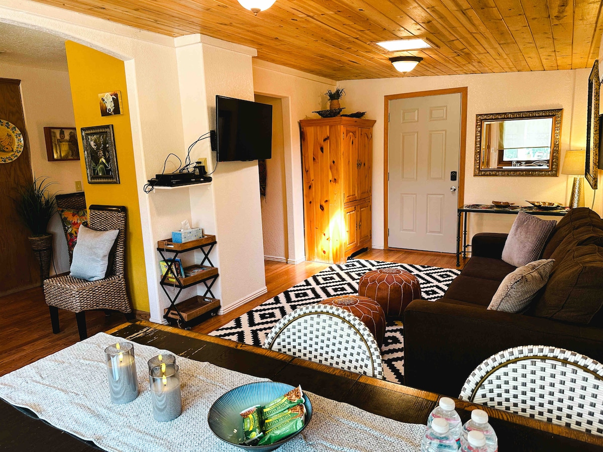 The Redwood Loft is conveniently located 2 minutes from the Sequoia National Park entrance gate & above the Totem Market BBQ Deli featuring a Redwood Wine Lounge. The loft is approx 800 sq ft of stylish comfort and convenience. Features a king bed in primary bedroom and a Murphy bed in the living room with comfortable leather sofa, loveseat & large screen smart TV. Views with an airy, fun vibe. Listen to the river from spacious wood deck with fire pit and seating.
