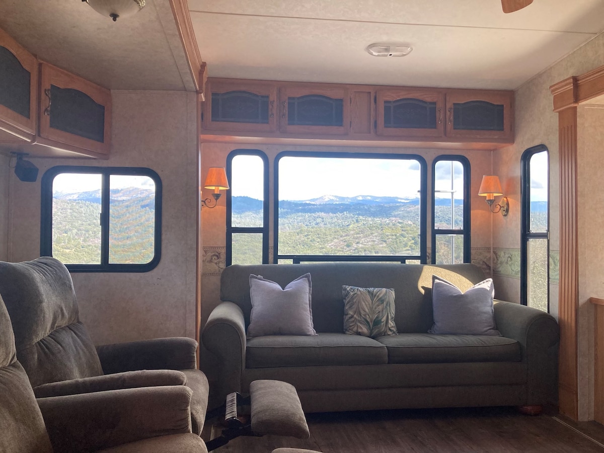 Esta propriedade fica a 1,6 km de uma estrada de terra. A estrada pode ser íngreme e acidentada em alguns lugares. Tivemos mais de 1200 pessoas aqui em cima sem problemas. Este é apenas um aviso, para que você esteja ciente antes de reservar. Quinta roda mais nova, iluminada e espaçosa de 34 pés com quatro escorregadores que acomoda 4 confortavelmente. Cozinha completa, bem como área de churrasco. Fogueira de propano montada para apreciar as excelentes vistas ou observar as estrelas. Tranquilo e isolado com belas vistas do Lago Isabella. A poucos minutos de montanhas, lago e rio.
