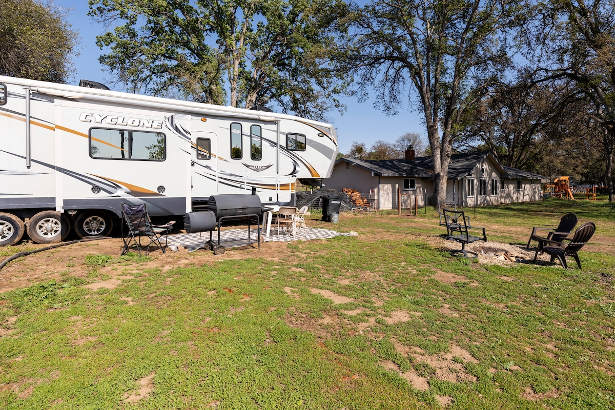 Esta 5ª roda totalmente renovada tem tudo o que você precisa, além de sem taxa de limpeza! Situado no topo de uma colina em um bairro tranquilo no sopé, você terá uma bela vista do nosso pequeno vale e montanhas. Possui uma cozinha completa com itens básicos para cozinhar, RO para água purificada, geladeira/freezer, cafeteira e Amazon Fire TV, WIFI, banheiro completo pequeno, mas bem equipado, cama queen size de látex natural, AC e aquecimento. Desfrute de café e ovos frescos, e enquanto você assiste os porcos e galinhas pastarem abaixo.