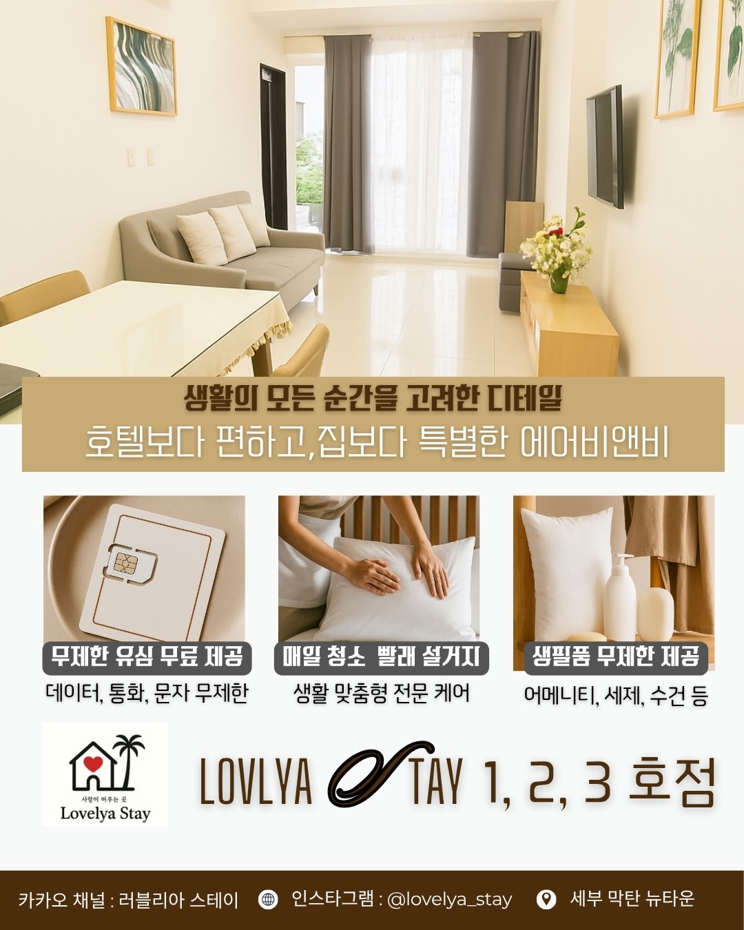 러블리아 스테이는 같은 컨디션, 같은 서비스를 제공하는 1, 2, 3호점이 있습니다. 호스트의 다른 숙소 확인을 통해 상세 정보를 확인 하실 수 있습니다 :) ㅋㅏㅋㅏ오 채널 : 러블리아스테이 사랑이 머무는 곳, Lovelya Stay No.1 🤍 🤍 탁 트인 씨뷰와 함께 시작되는 하루. 🤍 생활의 모든 순간을 고려한 디테일. 🤍 ‘호텔보다 편안하고, 집보다 특별한’ 휴식처. 🤍 막탄에서 가장 쾌적한 뉴타운에서, 깔끔하게 정돈된 세부를 만나보세요 - 오래 머물고 싶은 공간 Lovelya Stay. 당신의 세부 여행에서 가장 편안했던 공간으로 기억되길 바랍니다. - 💕 세부 라푸라푸시 막탄 뉴타운(Mactan Newtown, Lapu-Lapu City, Cebu) ➖➖➖➖➖➖➖➖➖➖➖➖➖➖➖