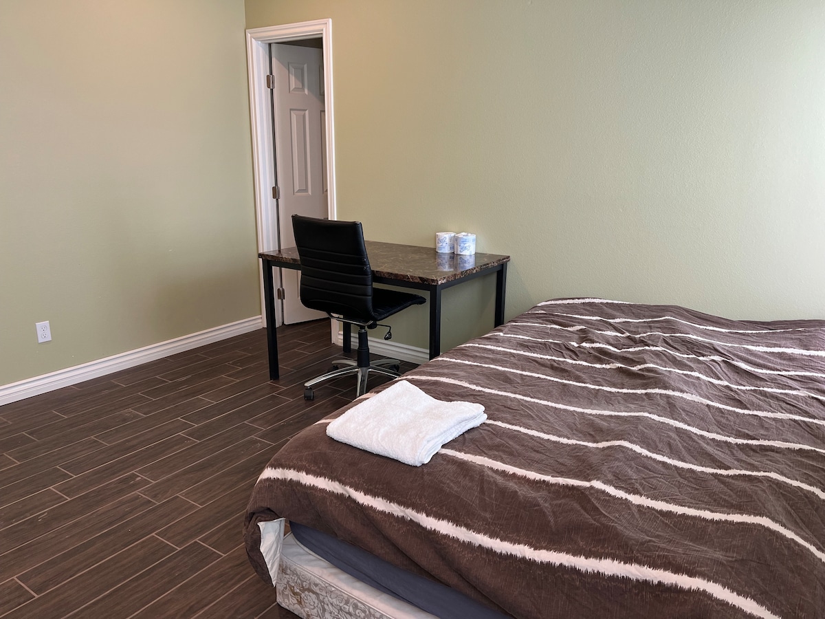 This private one-bedroom suite offers exclusive use of all amenities. The bedroom features a king-size bed and an adjustable sofa, perfect for relaxing and watching TV. A separate bathroom ensures your privacy. The property is conveniently located near Highways 15 and 60. It's just a 15-minute drive from Ontario Airport, and the nearest park and golf course are only a 5-minute walk away. This spacious and tranquil suite is the ideal place to unwind and escape the stresses of everyday life.