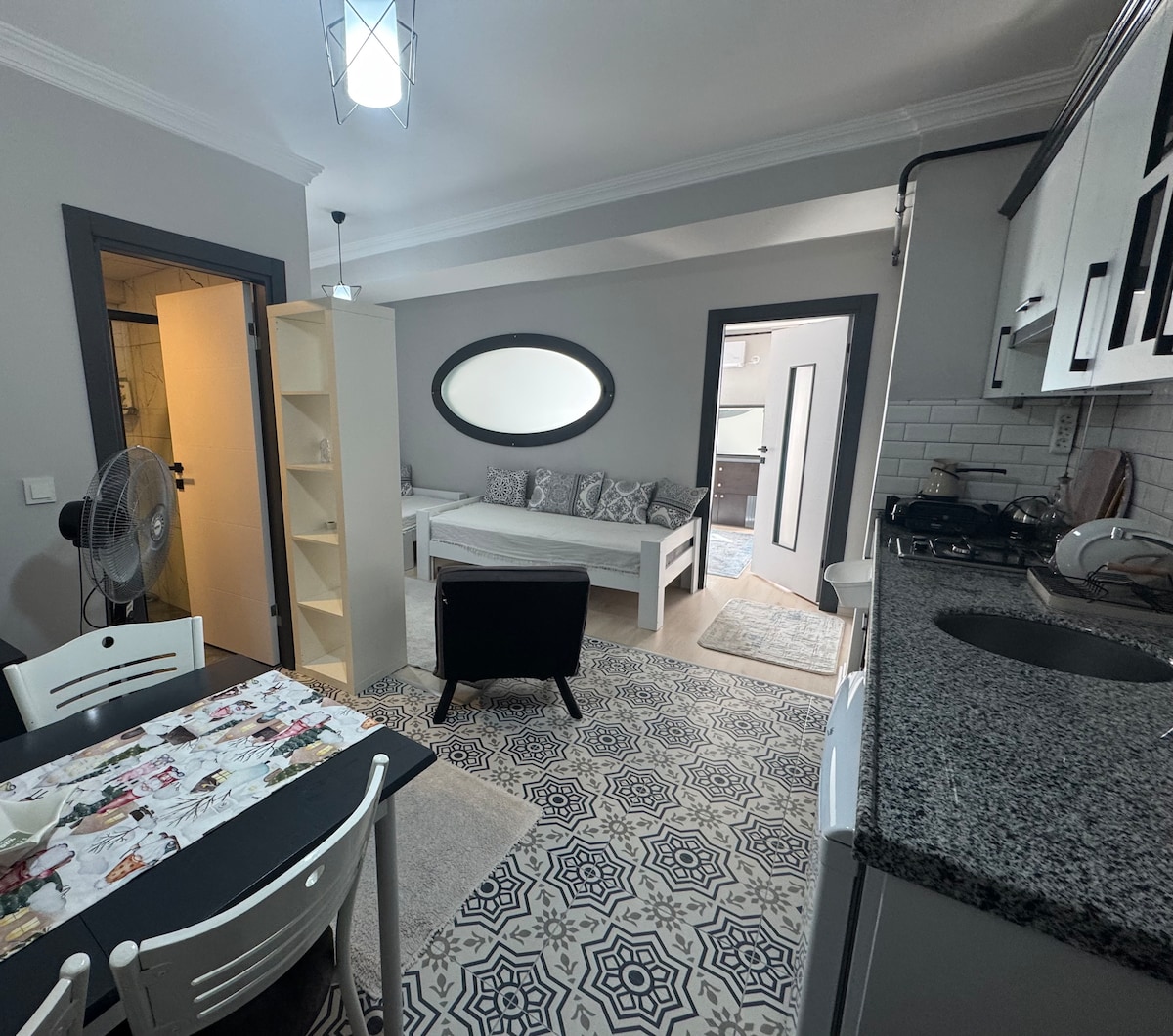 Nosso apartamento 1+1, localizado em uma posição central, a 2 minutos a pé da praia de Yeni Kordon, tem uma cozinha separada e varanda. O apartamento tem televisão, máquina de lavar roupa, geladeira grande e Wi-Fi. Todos os utensílios de cozinha que você possa precisar estão disponíveis. Com uma cama de casal e um sofá-cama, pode acomodar até 3 pessoas. Você também pode aproveitar essas oportunidades e vantagens de localização central enquanto se hospeda em nosso apartamento.