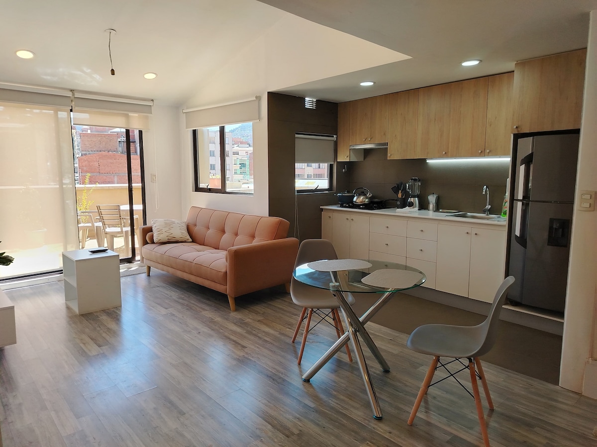 Loft moderno e totalmente equipado, a 4 minutos do aeroporto e a 10 minutos dos teleféricos. Perfeito para voos antecipados/tardios. Ideal para descanso ou estadias longas (estudo/saúde). Refúgio acolhedor com fogão, cobertores extra e um duche quente garantido. Cozinha totalmente equipada, Smart TV e uma poltrona de leitura num edifício moderno com elevador. Descubra El Alto: uma zona central, segura e acessível. Oferecemos-lhe dicas e itinerários para desfrutar da Feria de Julio 16 e deslocar-se como um habitante local. A sua casa luminosa nas alturas!