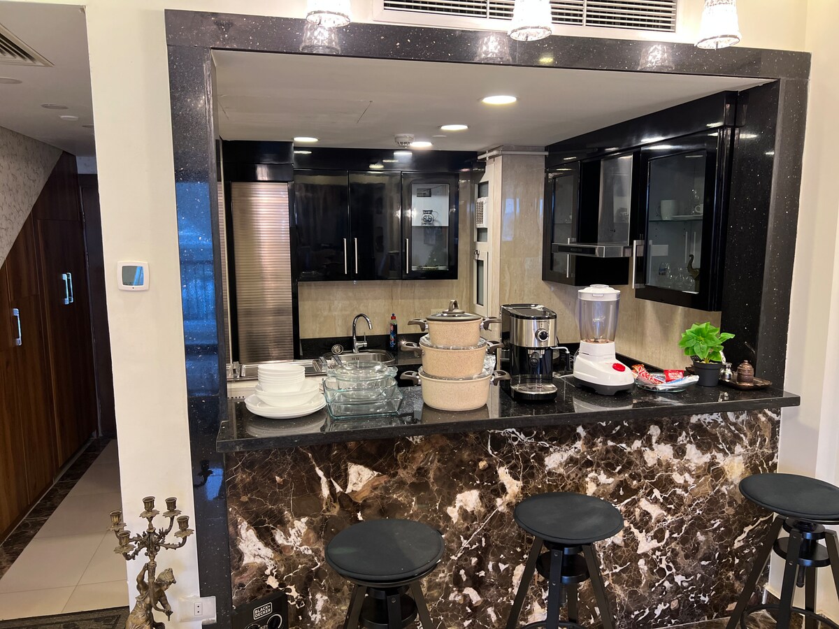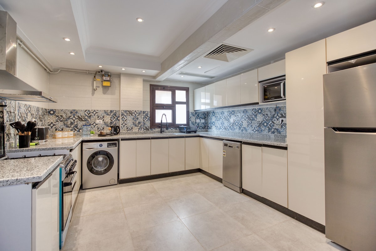 Por favor, veja os comentários. Aproveite com toda a família neste alojamento elegante e confortável. O seu apartamento no telhado fica no quinto andar e há um lanseir para o quarto andar do Complexo de Acacia em frente ao Portão 5 e 6 Rehab a 5 minutos a pé de locais de piquenique, bancos, lojas e shoppings do Aeroporto Internacional do Cairo Apartamento 2 Quartos 3 quartos e corrida Vivendo com cozinha moderna Cozinha americana aberta, cozinha americana, 2 terraço Beach e 2 Terrace Beach e cozinha totalmente equipada e cozinha equipada com mobiliário moderno totalmente equipado Wi-Fi Smart TV 55 ", e o serviço de propriedade Netflix com câmaras de vigilância e segurança e escolta
