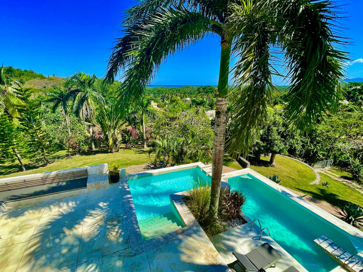 Moradia com piscina privada e vista para o mar em Las Terrenas, ideal para 6 pessoas. Localizado numa colina na zona tranquila de Hoyo del Cacao, oferece privacidade, natureza e vistas panorâmicas para o mar. Possui 3 quartos, 2 casas de banho, uma sala de estar luminosa, vista de 180 graus para o mar a partir de terraços espaçosos e uma piscina privada espetacular para desfrutar do clima das Caraíbas. Um retiro perfeito para relaxar, a poucos minutos das praias e do centro da cidade.