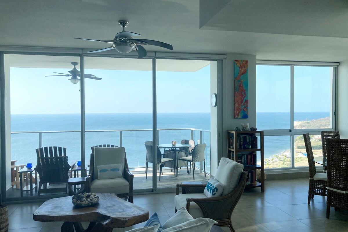 Novo condomínio moderno com vistas deslumbrantes para o Oceano Pacífico. Estamos num belo complexo de praia novo, Punta Caelo, com acesso directo à praia, um clube de praia e várias piscinas grandes. A Área Social é de qualidade resort com espreguiçadeiras, piscinas de borda infinita, bilhar, piscinas infantis e camas de piscina. O apartamento é aberto e espaçoso, com uma cozinha totalmente abastecida e um amplo terraço com vista directa para o oceano.