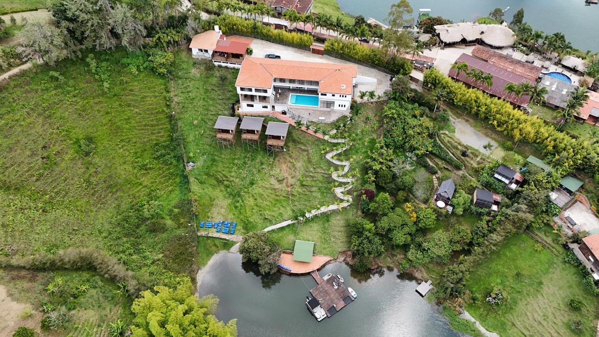 A Villa EcoLuxe é uma propriedade exclusiva em Guatapé com acesso direto privado ao lago e vistas espetaculares. Tem 9 quartos com casa de banho privativa, 3 deles com jacuzzi e vista para a barragem. Desfrute de piscina para adultos e crianças, 2 jacuzzis adicionais, campo de futebol, 3x3 ecrãs LED e estacionamento para 30 veículos. Ideal para famílias, grupos e celebrações que procuram luxo, privacidade e natureza num só lugar.