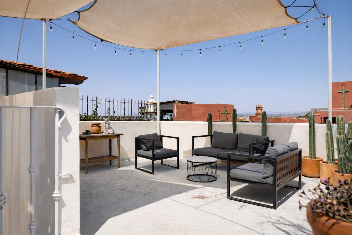 Vistas e localização magníficas. Diretamente acima do Parque Juarez e abaixo do mirante Mirador. A poucos quarteirões da praça principal. Nossa casa está localizada atrás e acima de outra propriedade, permitindo um ambiente tranquilo e privado, enquanto desfruta de vistas panorâmicas deslumbrantes do centro de San Miguel, suas igrejas e o campo distante. Os quatro níveis desta propriedade permitem uma definição clara do espaço, mas em socalcos uns nos outros, criando uma sensação de amplitude enquanto se beneficia da vegetação exuberante das árvores circundantes e paredes cobertas de videiras. Vários terraços e fontes definem o tom de uma atmosfera relaxante nos interiores limpos e brilhantes que lembram o Mediterrâneo. No nível principal, você encontrará a sala de estar, sala de jantar e cozinha totalmente equipada com sistema de purificação de água de casa inteira, bem como uma varanda e o quarto de hóspedes com banheira privativa. Abaixo, há um jardim privado com um estúdio que proporciona o ambiente perfeito para a criação artística. O quarto principal, localizado no andar de cima, é incrível e é amplo e aberto. A cama king size localizada no centro está de frente para a vista, portas francesas e varanda. O banheiro privativo tem um chuveiro grande e clarabóia acima. Junto ao quarto há um escritório privativo que oferece Internet e Wi-Fi em toda a casa e com vista para a Capela da Santa Cruz de Chorro do século XVII, o segundo cenário mais histórico de San Miguel de Allende. Diretamente acima do quarto principal, você encontrará a vista mais inspiradora de San Miguel a partir do terraço ou do conforto de um grande terraço sombreado. Desfrute de um coquetel ao pôr do sol ou café expresso no bar do terraço enquanto relaxa e aprecia a vista. Trabalharei com você em todos os detalhes antes da sua chegada. Uma vez em San Miguel, nosso gerente de casa, Jose, está na cidade e disponível. Esmeralda, nossa governanta, estará lá 3 vezes por semana às terças, quintas e sábados, normalmente por volta das 9h.