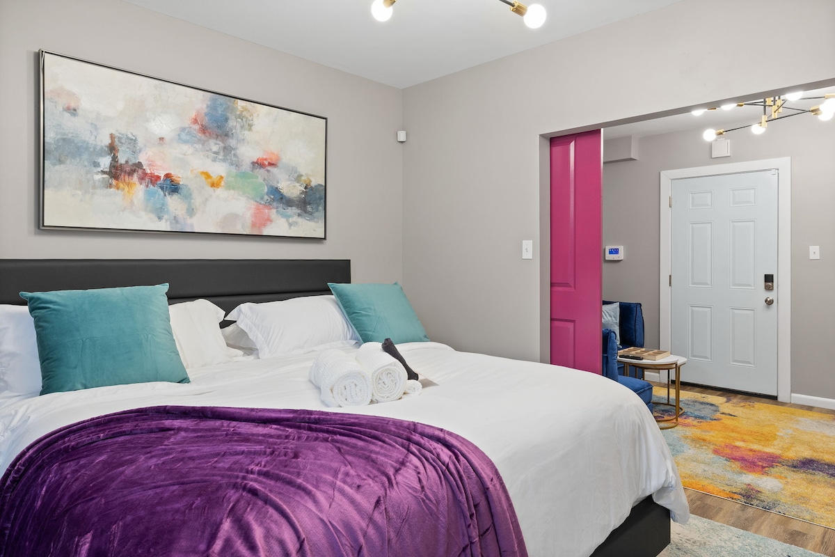Apartamento de arte🎨 pop: sofá-cama, banheiro privativo e cozinha completa
