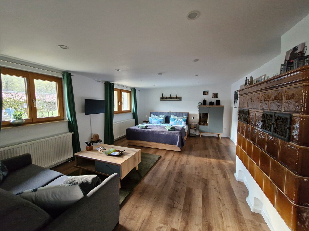 Apartamento moderno em uma fazenda de laticínios. O apartamento fica em um edifício separado em nosso conjunto de fazenda isolado. Terraço espaçoso e vista gratuita para o vale convida você a relaxar. Você não ouve nenhuma rua ou carros e ainda assim relativamente perto da estação de trem ou de compras (5 km). Você pode chegar a restaurantes a pé (15 min). Ponto de partida ideal para caminhadas, viagens pela cidade ou apenas relaxar.
