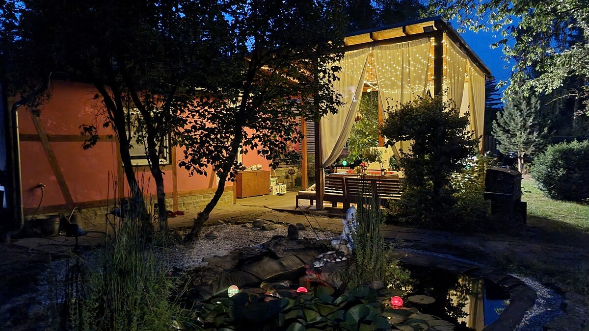 A nossa pequena casa de verão está localizada a cerca de 4 km do centro da cidade de Erfurt. É muito tranquilo e idílico, tem uma bela vista sobre a cidade. O jardim tem um monte de prados, árvores, tem cerca de 650 metros quadrados e está totalmente vedado. O quarto é pequeno, tem uma cama box spring (1,40 × 2,00m) e TV. A nossa sala de estar está equipada com TV,sofá-cama, um pequeno fogão de azulejos e mesa de jantar. No terraço há uma área de estar e uma cama de dia.
