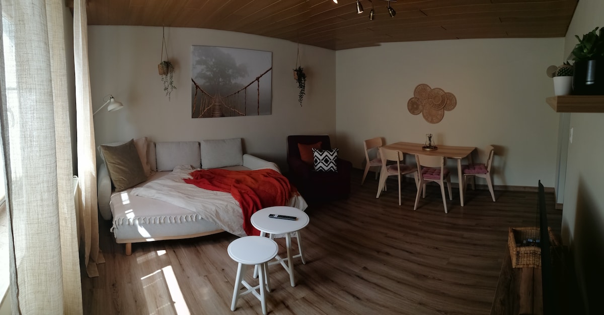 O apartamento aconchegante e bem iluminado na idílica cidade vinícola de Erlabrunn, logo às portas de Würzburg, oferece 50 m² de espaço suficiente para até quatro pessoas. Uma grande sala de estar/área de dormir e uma cozinha separada com sala de jantar estão à disposição dos hóspedes. Diretamente ao lado do apartamento, um pequeno terraço com churrasqueira convida você a relaxar e passar um tempo, onde você pode terminar o dia com um copo de vinho após um dia agitado.