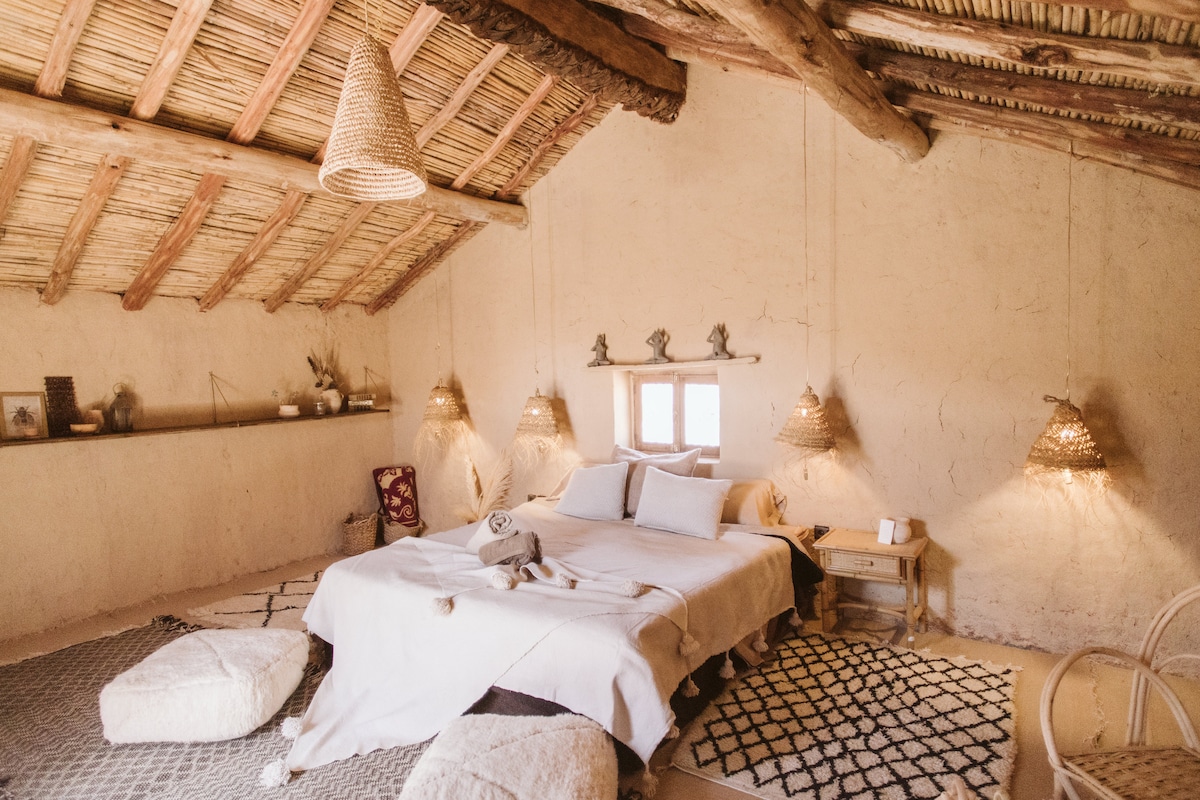 Desconecte-se da rotina neste alojamento único e relaxante. Um lugar com 6 cabanas para compartilhar com amigos, familiares e/ou viajantes, o quarto é privado e há um pátio central onde você pode compartilhar. É um lugar perto da agitação turística das grandes dunas, mas ainda longe o suficiente para desfrutar do ambiente e da atmosfera real do deserto
