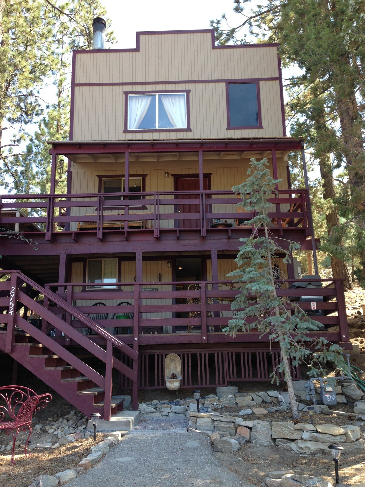 Aninhado em pinheiros altos - esta é uma fuga perfeita da montanha! Vistas panorâmicas da montanha a apenas 2 quarteirões de distância de caminhadas na floresta nacional. Banheira de hidromassagem, três níveis de decks com churrasqueira e assentos ao ar livre. Lareira de pedra, 2 televisões de ecrã grande, pisos Travertino, cozinha totalmente abastecida com forno duplo. A 13 km do Snow Summit - cerca de 10 minutos de carro. Propriedade isolada de Mary Astor, atriz de cinema mudo (Maltese Falcon).
