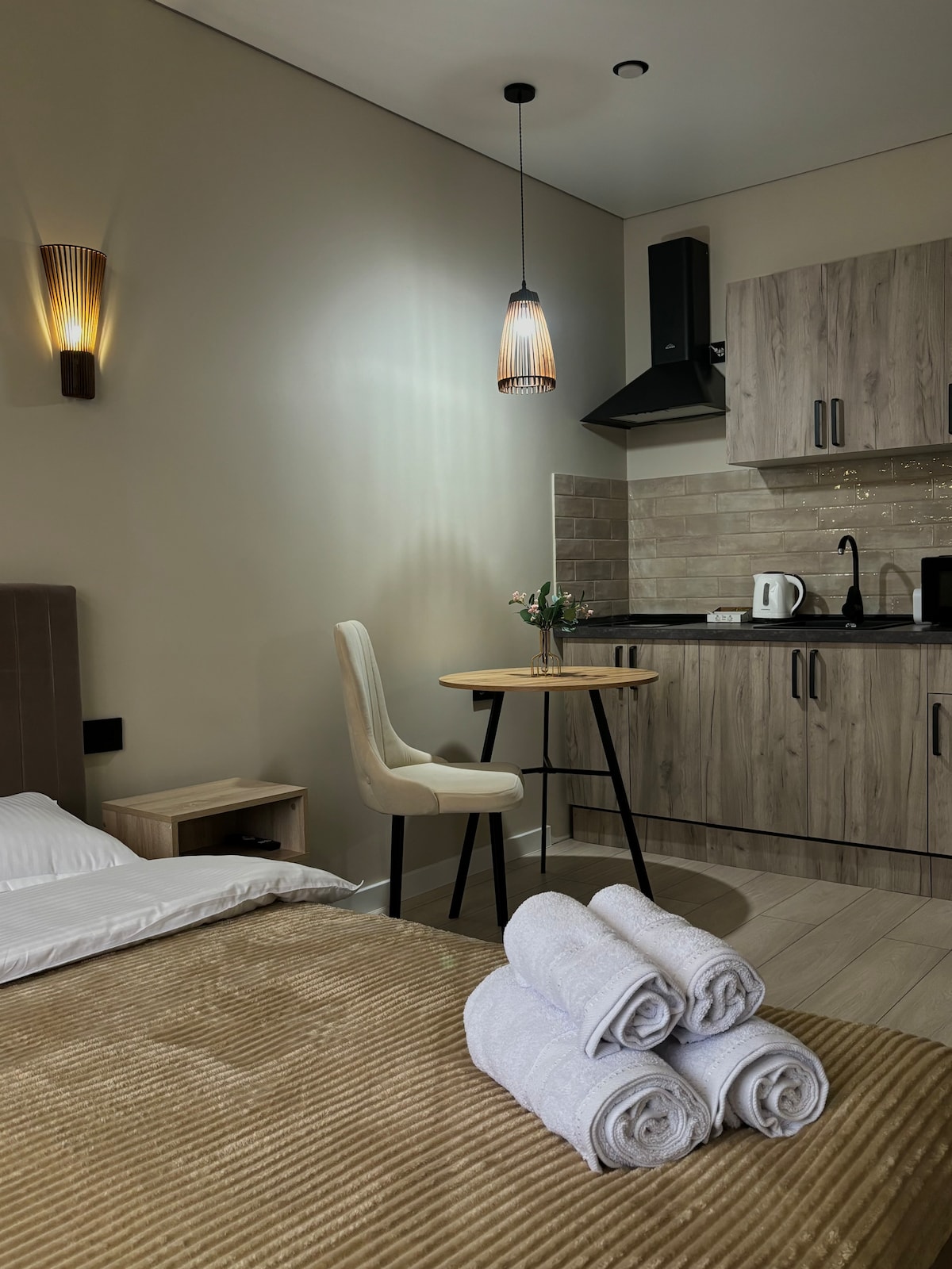 Apartamento moderno e elegante na cidade, perfeito para relaxar ou para viagens de negócios. Quarto acolhedor com uma cama grande, cozinha totalmente equipada, casa de banho com chuveiro e todas as comodidades necessárias para uma estadia confortável. Wi-Fi gratuito, TV em streaming e ar condicionado. O lugar perfeito para a sua estadia Um apartamento espaçoso com renovação de design e uma atmosfera acolhedora. Todos os detalhes são pensados até ao mais pequeno detalhe: mobiliário e decoração elegantes, cores neutras e detalhes que criam uma atmosfera de relaxamento