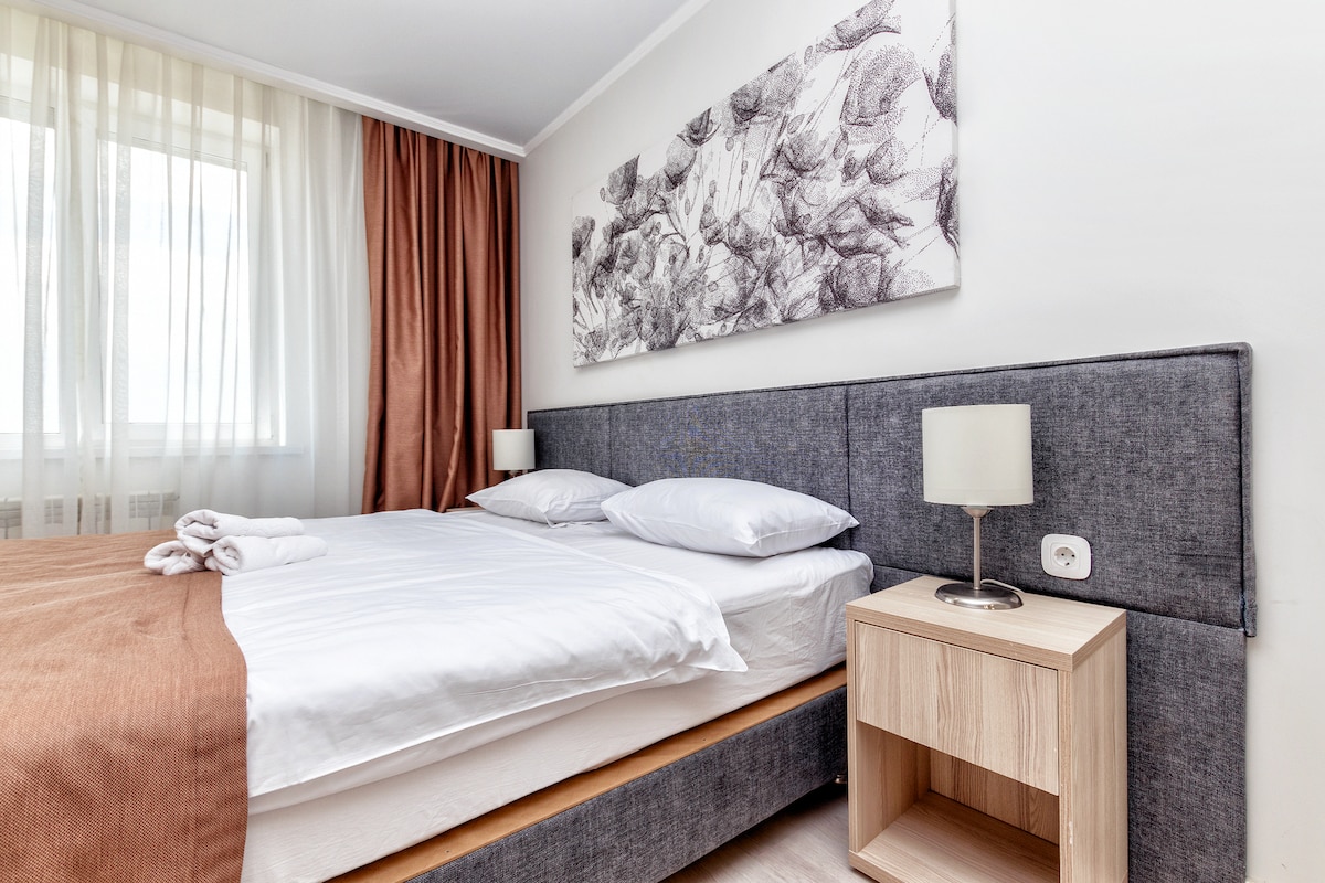 Bem-vindo ao apartamento no Jardim Botânico! 🌿 🌳 Ótima localização: do outro lado da rua fica o Jardim Botânico, perto da Barys Arena e da Astana Arena para os amantes de desportos e concertos. 🏡 Um apartamento com renovação super moderna, uma sala de estar espaçosa, uma cozinha totalmente equipada e um quarto acolhedor. Lugar perfeito para ficar e ficar no coração da ação!