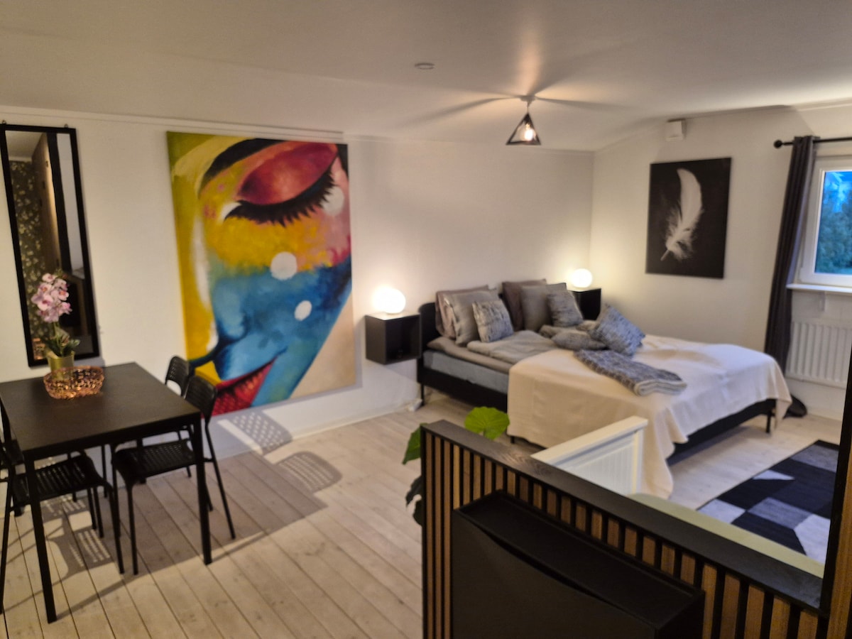 Discover luxury at our renovated guesthouse, ideal for relaxation. Reach the city center easily by bike or bus every 10 minutes. Hiking spots and the beach are a short 15-minute walk away, with free parking. Take day trips to Lund, Malmö, or Copenhagen via train, just a 5-minute walk, or ferry to Denmark. Explore downtown Helsingborg's dining scene or nearby shopping center in 10 minutes by car. Biking enthusiasts will love our proximity to the Kattegatsleden and Sydkustleden trails.