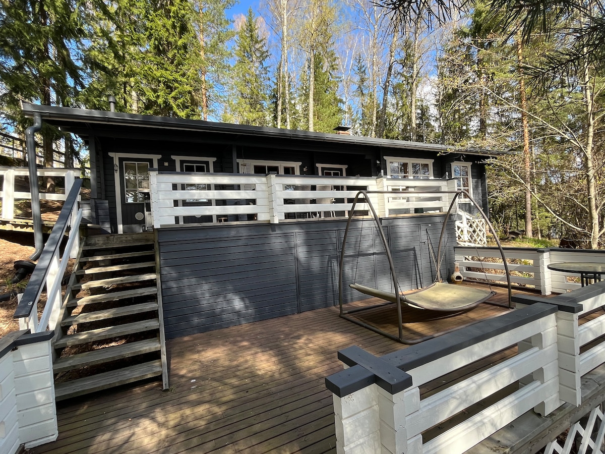 Stylish urban cabin/mini house approx. 45 m2 with an unobstructed lake view. Here you can feel like you're at a cottage, even though the center of Helsinki and the airport are less than 20km away. The recently renovated house is accompanied with a cozy yard area surrounded by wonderful scenery! For an additional fee, the outdoor hot tub with an amazing view to the lake is available for use. Four adults can fit to sleep in the cottage comfortably, possibly more if you squeeze up.