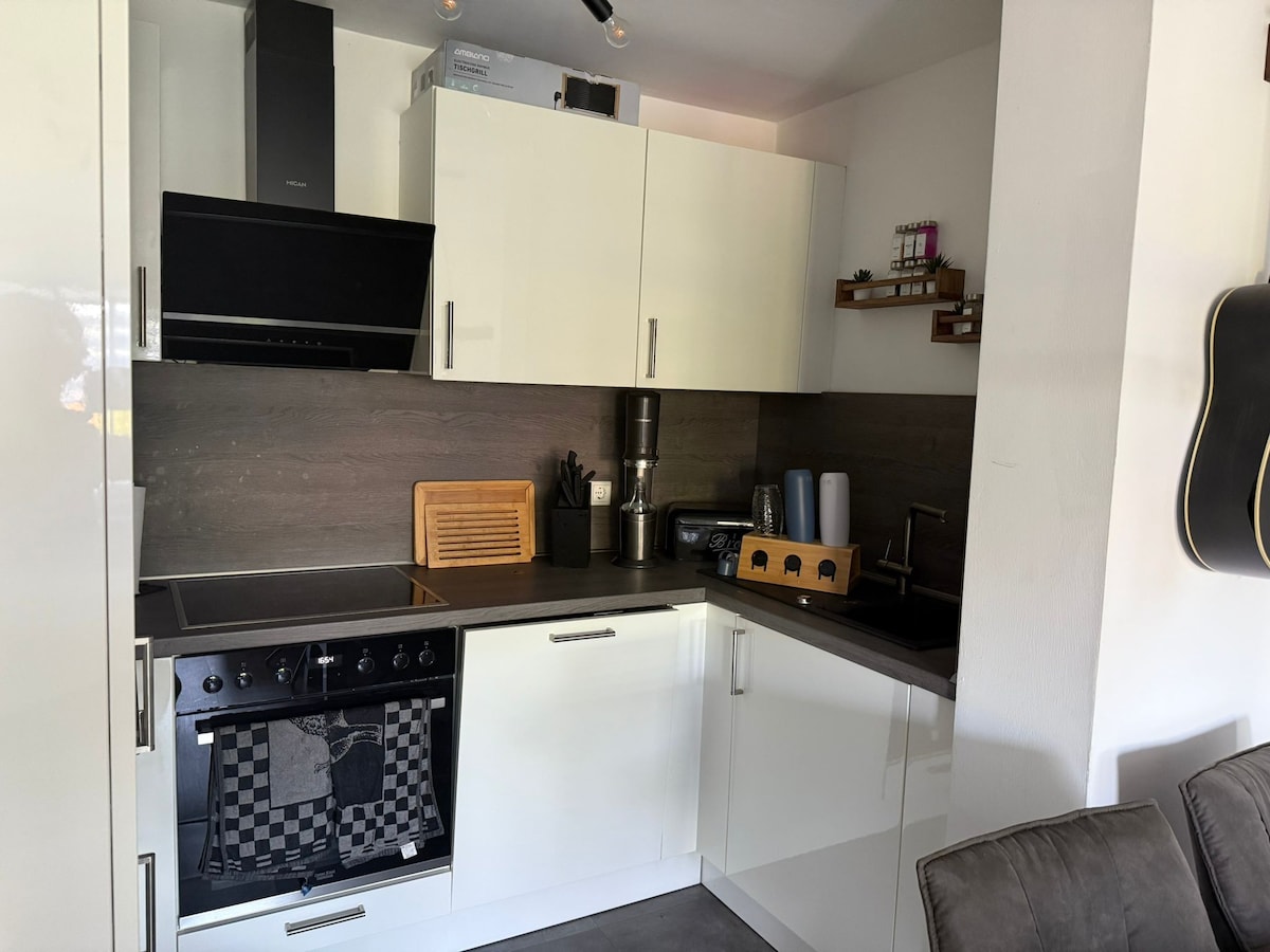We warmly welcome you to our cosy flat. The flat is located in a quiet no-through road with enough parking spaces in the beautiful Hagen-Emst district. A separate entrance with a covered terrace facing south leads to the living room/bedroom, fully equipped kitchen and modern bathroom with walk-in shower. Surroundings: - Walking distance to the Stadthalle (10min), Hagen city centre (15min). University of Applied Sciences Südwestf., Fern-Uni (10 min by car). Bus stops on site.