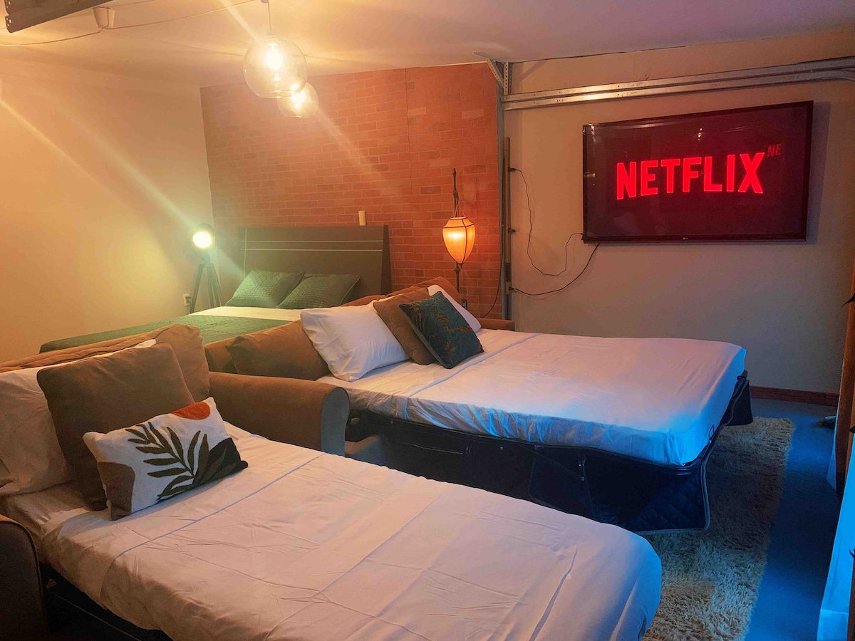 This private, family-friendly suite features a spacious living room that opens to a secluded patio with a fire pit and outdoor dining area—an ideal retreat for a small family or a couple seeking peace and quiet while staying close to the city. Inside, you'll find a cozy living space with a queen bed, an attached bathroom, a sofa bed, a TV, a writing desk, and a convenient kitchenette equipped with a fridge, microwave, and coffee maker.