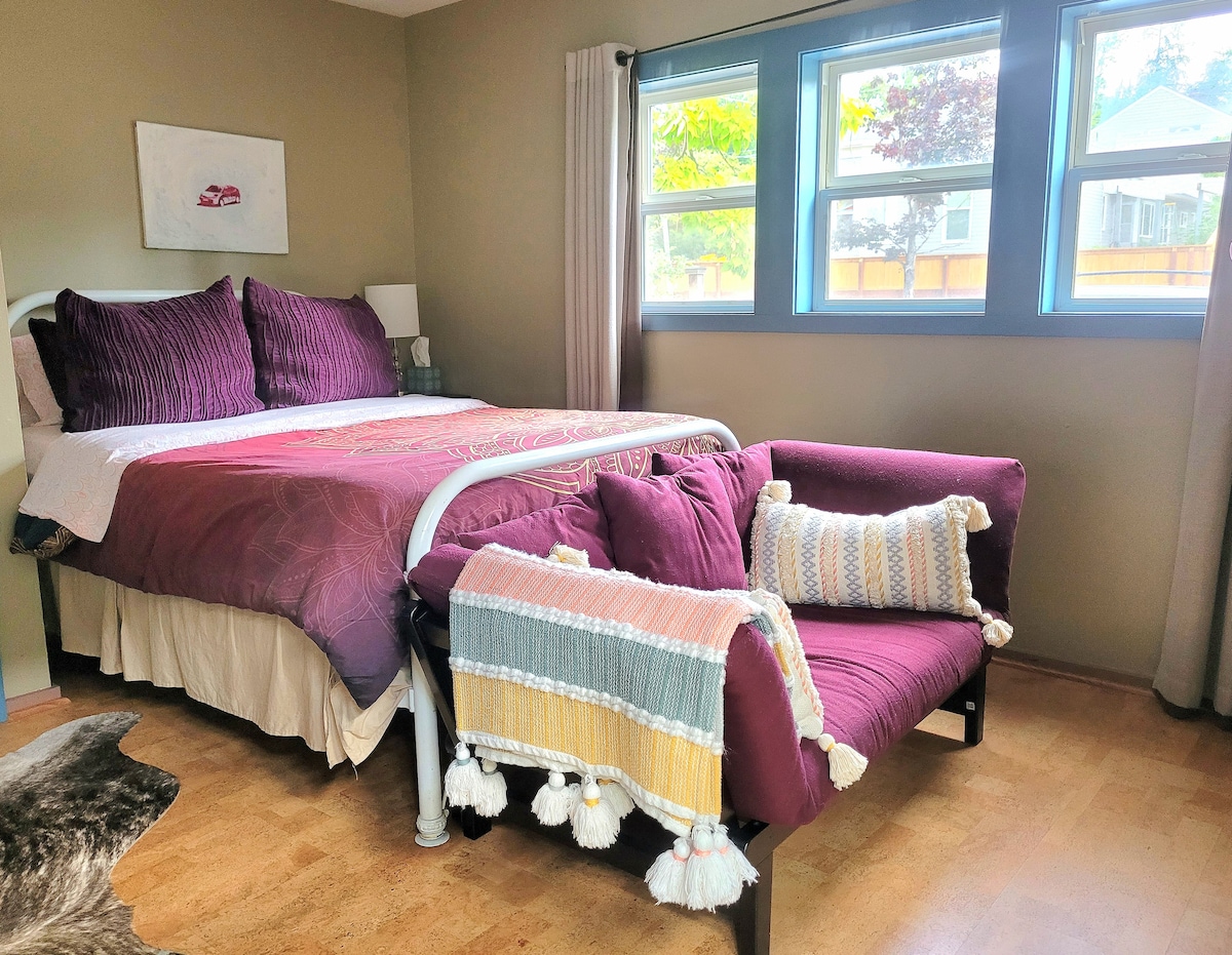 This studio is walking distance to the University of Oregon, the Hult & Shedd Performing Arts Centers, The Jazz Station & Downtown Eugene. Eugene full of character, eateries and entertainment. The attached studio has a separate entrance, a kitchenette & outdoor patio. The main bed is a queen and the second is a twin that is a futon love seat with ottoman. If there is a third person it would be best to be a small child. The space is small and is best for 1-2 people.