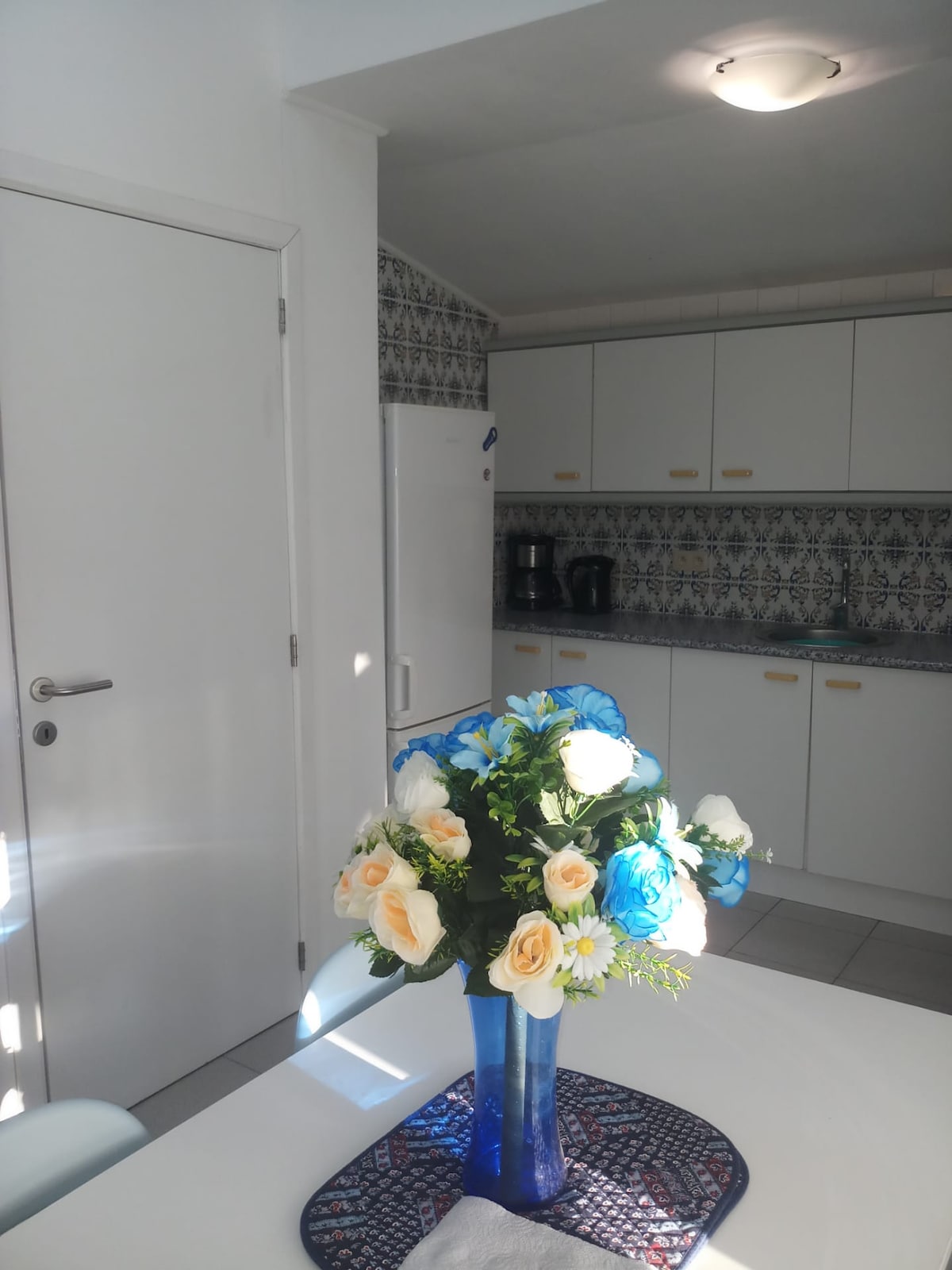 O azul é composto por uma sala com mini-cozinha equipada, sofá cama duplo, TV, Wi-Fi, ar condicionado, 1 quarto com cama de casal e 1 casa de banho. Acomodação máxima de 4 pessoas. Jardim com piscina, churrasqueira, espreguiçadeiras, redes de baloiço, zonas para as refeições no jardim e dois pequenos lagos. Não é possível trazer animais de estimação. ATENÇÃO: TEMOS 7 GATOS. O jardim e a piscina, são partilhados pelos dois alojamentos. O jardim possui 2 câmaras de vigilância.