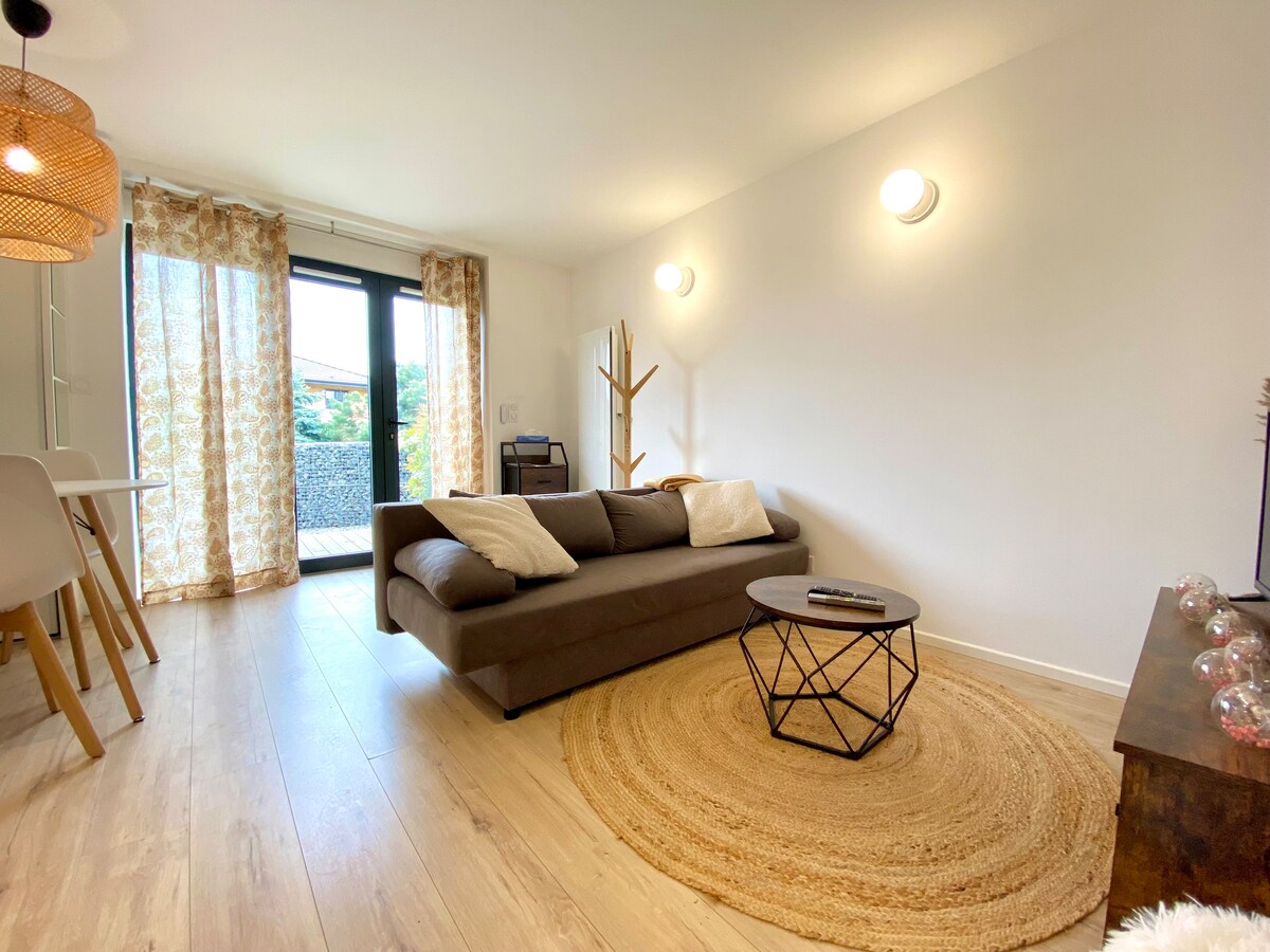 Dou-lhe as boas-vindas ao meu encantador estúdio, calmo e relaxante, durante a sua cura termal (parque em frente) ou para uma "parada em Thonon". Em uma residência intimista e segura, a dois passos do centro da cidade e do lago, e de todas as comodidades. Estacionamento privativo no subsolo e gratuito. Roupa de cama e toalhas fornecidas.