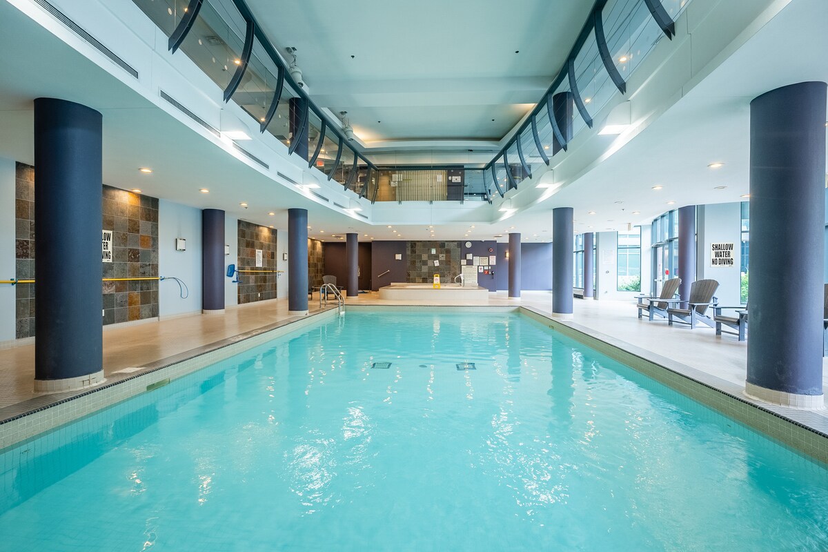 Damos-lhe as boas-vindas à nossa moderna e luxuosa penthouse de canto! Com um design elegante, vegetação exuberante e toques sofisticados, este espaço luminoso oferece conforto, elegância e uma vibração tropical descontraída. Desfrute de vistas panorâmicas deslumbrantes da cidade e relaxe com comodidades premium, incluindo uma piscina exterior, banheira de hidromassagem e sauna a vapor. A apenas 15 minutos de carro do centro da cidade. Transporte público à porta. A 10 minutos de carro do Rogers Stadium. Perfeito para hóspedes exigentes que procuram uma estadia elevada no vibrante núcleo urbano de Toronto