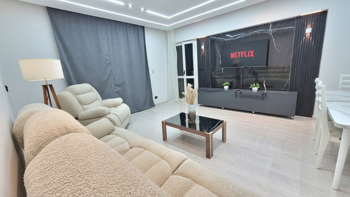Experience New Cairo in style! Stay in this modern newly renovated apartment 3 minutes from Al-Rehab. Located on the fourth floor with a great view overlooking the street, although there is no elevator but we offer free luggage assistance upon arrival! located near restaurants, bakeries, supermarkets and a pharmacy with the Garden 8 mall nearby for all your shopping needs! Fully functioning kitchen and bathroom with smart TV to relax and watch your favorite shows after a great day out.