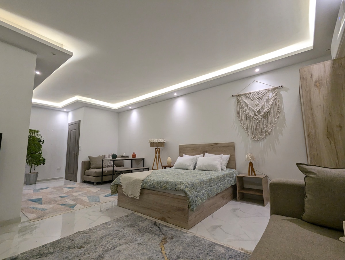 This unique place in North tessein 2 mins from AUC has a unique style. Inside a private compound , one bedroom, private bathroom,2 terrace, a big living room , kitchen , wi fi , smart TV, 2 air condition , free parking , access to the swimming pool. 25 miles to grand Egyptian musuem, few minutes to big famous malls in new cairo ( metro, carefour، Spinneys, lulu market, Cairo festival mall, visitors and alcohols are not allowed