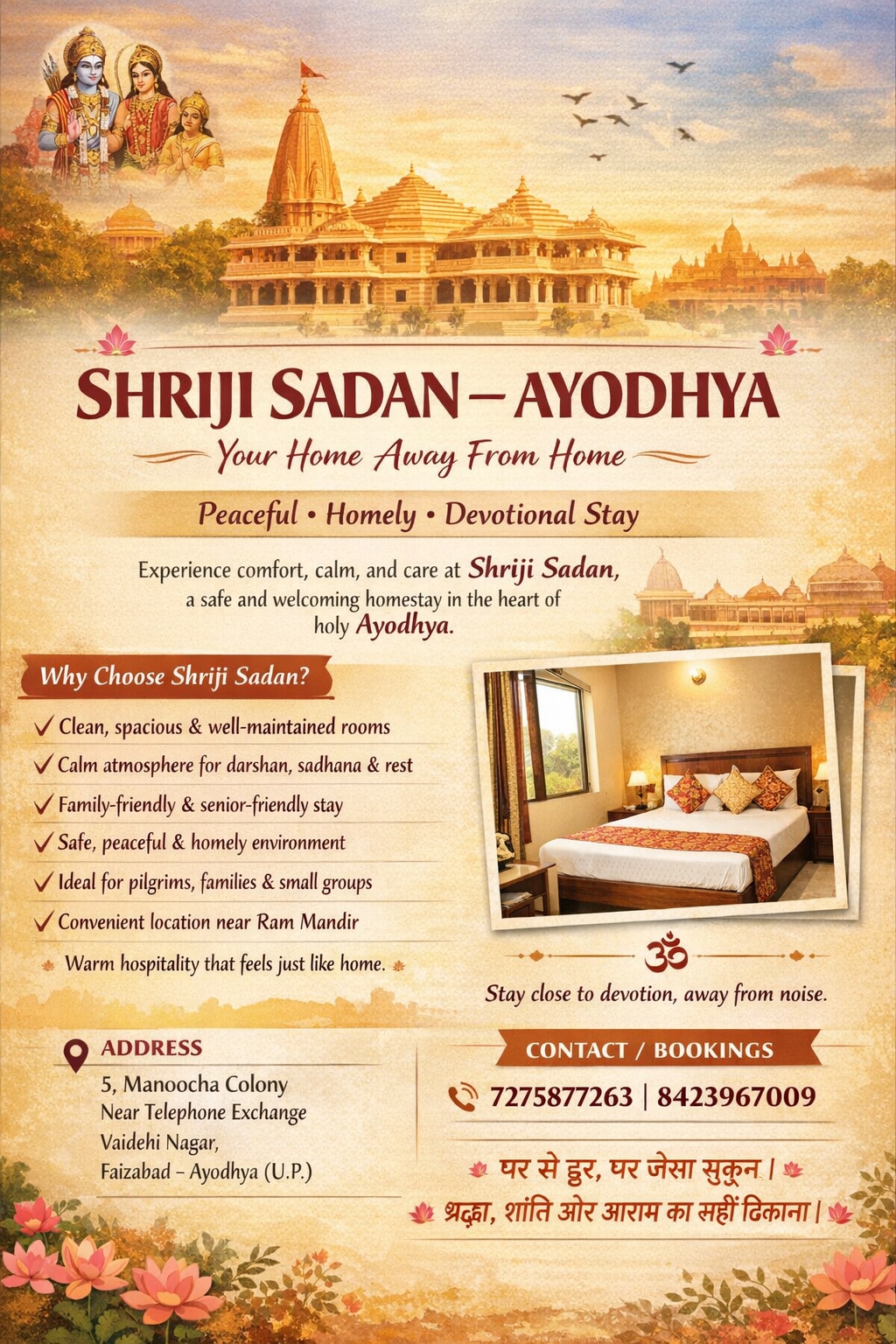 About Sreeji Sadan Ayodhya (500 Words) Sreeji Sadan Ayodhya is a serene and welcoming homestay nestled in the sacred city of Ayodhya, a place revered for its deep spiritual significance and timeless cultural heritage. Thoughtfully created to offer comfort, peace, and devotion under one roof, Sreeji Sadan serves as an ideal retreat for pilgrims, families, senior citizens, and travelers seeking a calm and homely environment during their stay in Ram Nagari.
