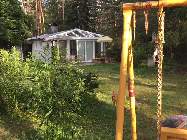A pequena casa de campo com conservatório pode ser alcançada em cerca de uma hora de carro de Berlim. A ligação com transportes públicos (comboio/autocarro) também é boa. Ideal para uma pequena pausa com o conforto necessário. A casa de campo no Wiesenrain está localizada numa propriedade muito grande, parcialmente arborizada. Faz fronteira diretamente com uma pequena reserva natural. Jardim de inverno, lareira, churrasqueira, áreas de jardim com áreas de estar e de descanso convidam-no a relaxar.