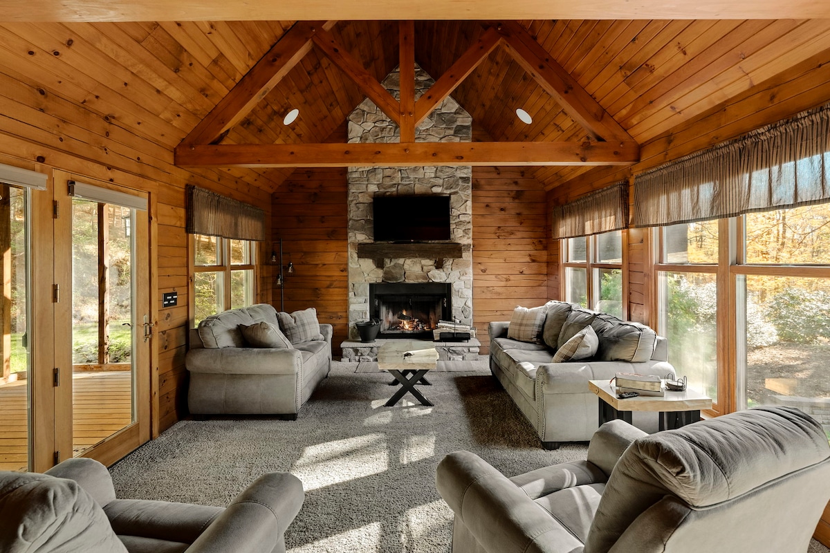 IG @montevistawv Luxo e conforto projetados profissionalmente para aluguel de curta duração 🏔️Vista panorâmica de 3 estados Campo de🏌️♂️ golfe 🏀 Pickleball, basquete, vôlei e tênis 🎮 PlayStation 5 Mini Disco Banheira ♨️ de hidromassagem para 6 pessoas 🔊Som Sonos em todo o lugar Carregador de veículos elétricos🔋 nível 2 Trilha de🥾 caminhada no local 🌳 33 acres privados, sem horário de silêncio 🔥 Lareira enorme + grelha e forno de pizza 🛋️ Lareira a gás aconchegante Wi-Fi 🌐 rápido e três TVs inteligentes de 65 polegadas 🛏️ 3 camas king size e beliche duplo Área de trabalho💼 exclusiva