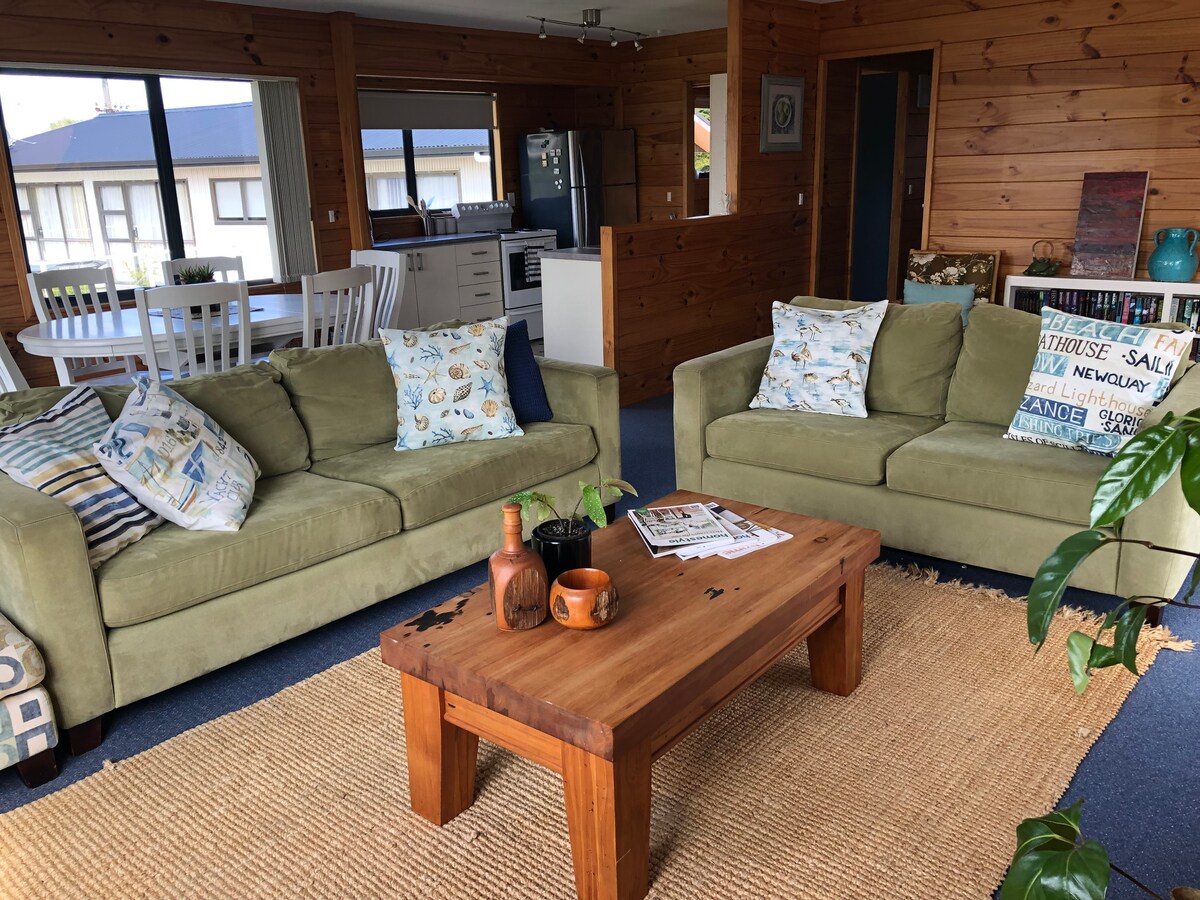 Vistas fantásticas para o mar. Bairro tranquilo. 5 minutos a pé da praia Casa de madeira interior - plano aberto. Decoração de bom gosto. 3 quartos com 2 camas queen e 1 cama de casal. Estúdio novo adicional com cama queen, casa de banho e área de estar com sofá-cama. Cozinha bem equipada. Grandes decks com mesa de jantar ao ar livre e cadeiras. Perto de inúmeras atrações turísticas - Cathedral Cove, Hahei, Hot Water Beach, Whitianga.