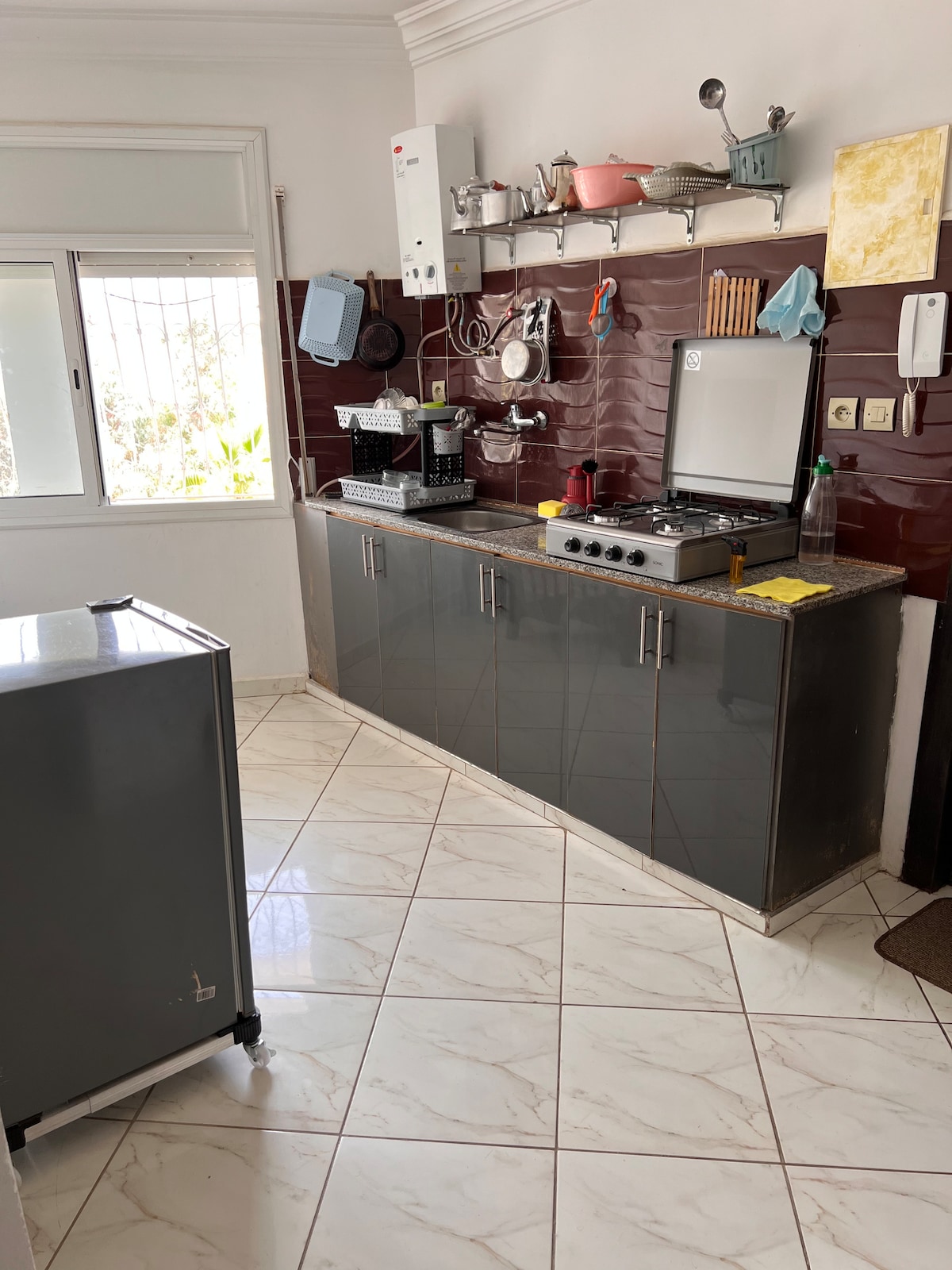Alojamento elegante, perfeito para famílias ou grupos de amigos que querem descobrir a cidade de Fez. Localizado no centro da cidade, perto de todas as lojas (estação ferroviária, mercearia, consulado francês, centro da cidade,etc.). Apartamento individual, localizado no primeiro andar de uma casa com entrada independente e segura. Completamente remodelado e contém todas as comodidades necessárias para uma estadia agradável. 2 quartos 1 cama de casal, 2 camas individuais + dormir na sala de estar (sofás)