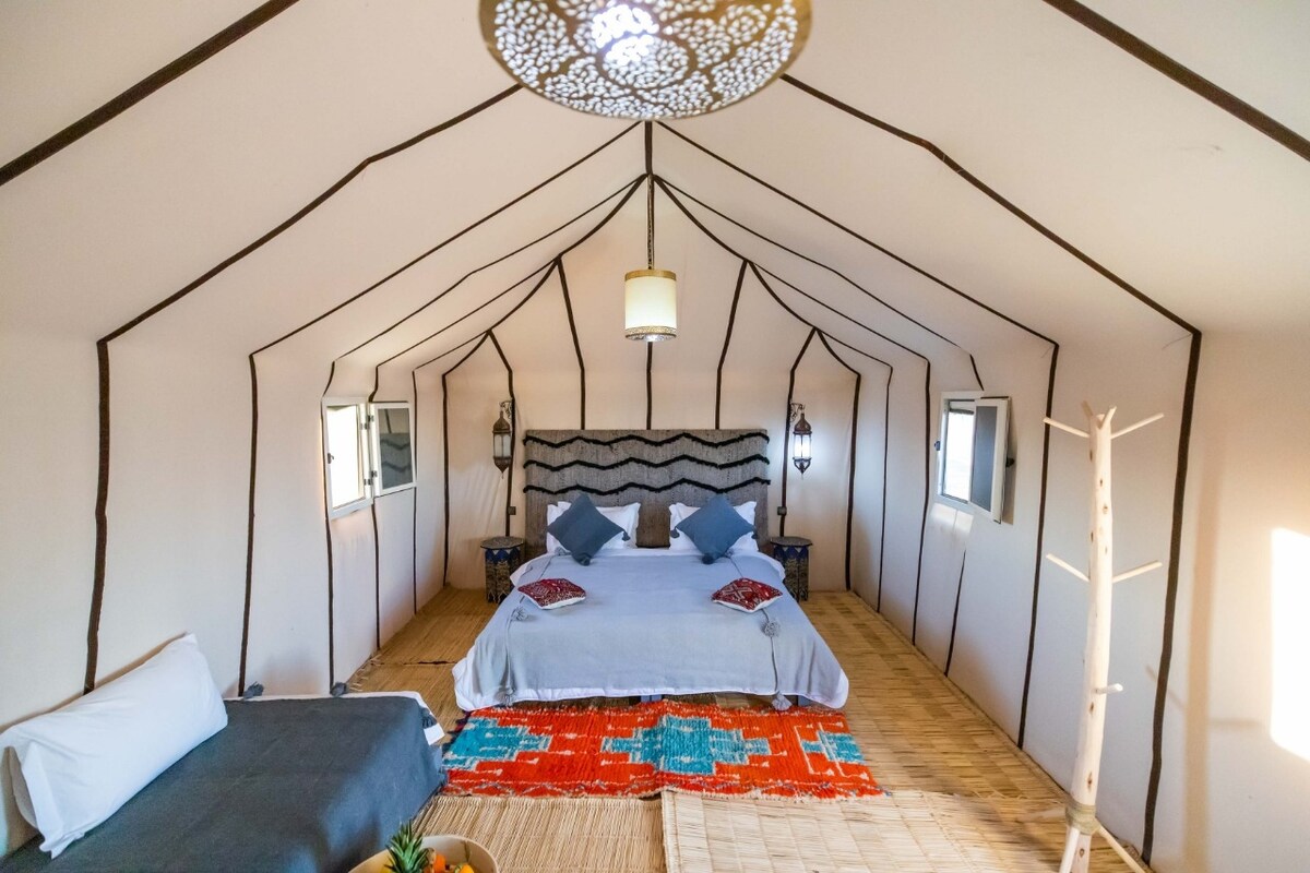 O nosso acampamento, aninhado no meio das dunas, abriga 10 tendas espaçosas, cada uma equipada com casas de banho e um chuveiro privado. Cada tenda tem uma porta com fechadura individual por dentro e por fora, com um cadeado fornecido gratuitamente pelo nosso serviço. Dentro destas tendas de 26 m ², encontrará uma cama king-size e uma cama individual, todas equipadas com roupa de cama de alta qualidade, incluindo almofadas, lençóis e toalhas.