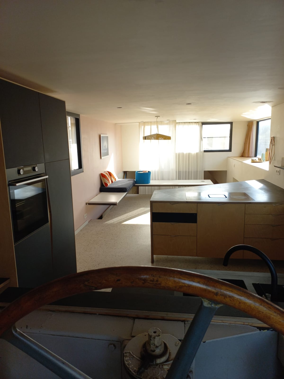 Um cargueiro, antigamente... quando se pegava a prancha, chegava-se a um primeiro terraço com churrasco Weber. Abra a janela deslizante vh e você está na sala de estar, maravilhosamente leve e fresco. Através de uma passagem você chegar à cozinha e sala de jantar.. Por favor, note, não uma coisa sueca pré fabuloso, mas agradável D.I.Y.! O quarto espaçoso com "duvidoso" tem vista para o cais em Turnhout, acredite em mim, romântico... A casa de banho é agradável e equipado com chuveiro. A casa do leme é ideal para ler sobre eventos.