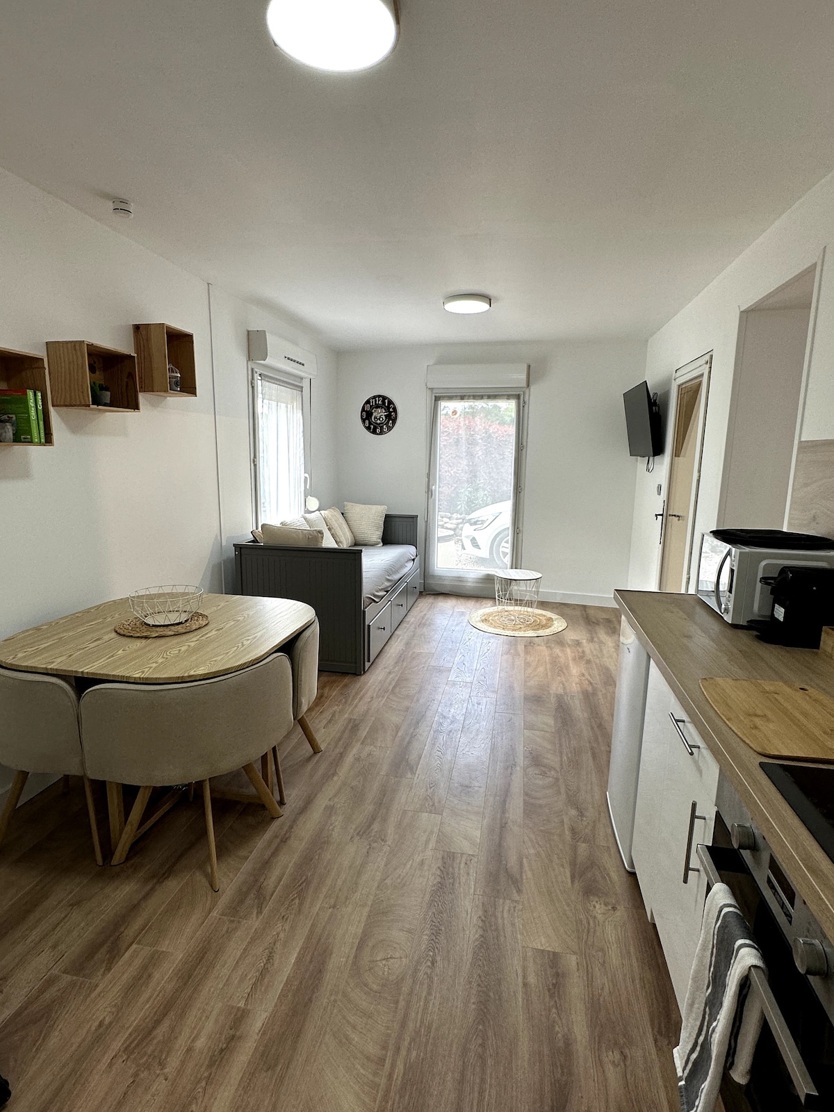 Casa de campo de 2 quartos de 40m2 ideal para 2 pessoas, mas pode acomodar um bebé. Sala de estar Jantar TV conectada com Netflix disney + vídeo premium e tv de maçã + fornecido no andar de baixo. WIFI, casa de banho equipada com cozinha. No andar de cima, um quarto duplo com jacuzzi, iluminação personalizável + ecrã QLED de 55 polegadas com Apple TV para desfrutar enquanto relaxa!! Estacionamento para 1 carro ou motos (MOTOCICLISTAS BEM-VINDOS🔥) ⚠️ SERVIÇOS OPCIONAIS SUSPENSOS POR AGORA⚠️