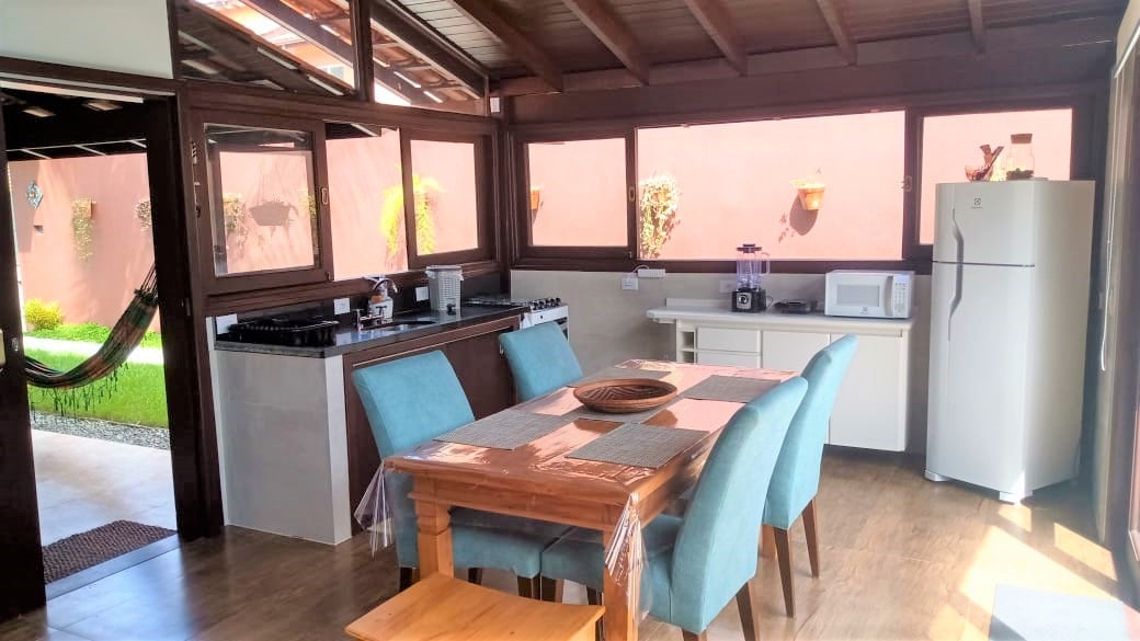 Casa recém construída, espaçosa e pertinho da praia. São 3 suites espaçosas no andar superior e um dormitório de apoio semi suíte no térreo! Com área gourmet, piscina linda com prainha, amplo deck para receber os amigos e com proteções para as crianças, sala e cozinha integrada que se estende a área gourmet! Estar externo confortável com ventiladores e todos os cômodos da casa com ar condicionado. A casa fica a 2minutos a pé da praia