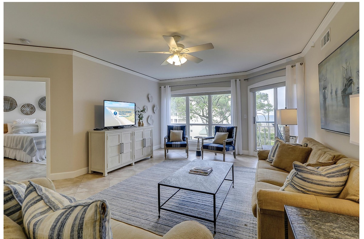 A nossa recém-renovada moradia 2 BR/2 BA Fiddler 's Cove está disponível para arrendamento! Localizado no tranquilo terceiro andar, o 24E é espaçoso e moderno. A cozinha possui novos armários, bancadas de quartzo, eletrodomésticos GE e prateleiras flutuantes. Atrás das portas do celeiro estão a máquina de lavar, a secadora e a despensa. As casas de banho atualizadas têm novas vaidades e azulejos. A área de jantar inclui um bar de café/vinho e assentos para seis pessoas. A área de estar tem um sofá-cama queen, cadeiras laterais e uma televisão de 65 polegadas.