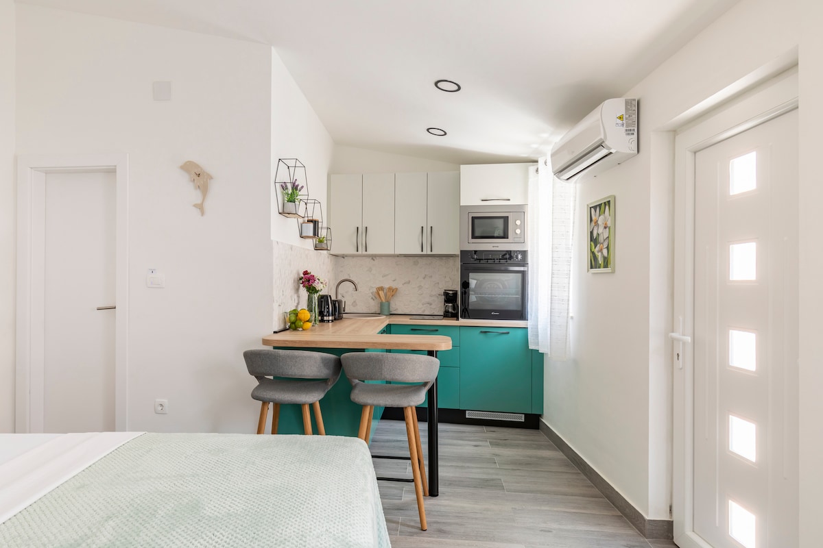 Enjoy your vacation with us and relax in our newly decorated studio for two, just five minute walk from town center. This studio apartment features sleeping area, bathroom with walk in shower and washing machine, fully equipped kitchen with dining area and patio.