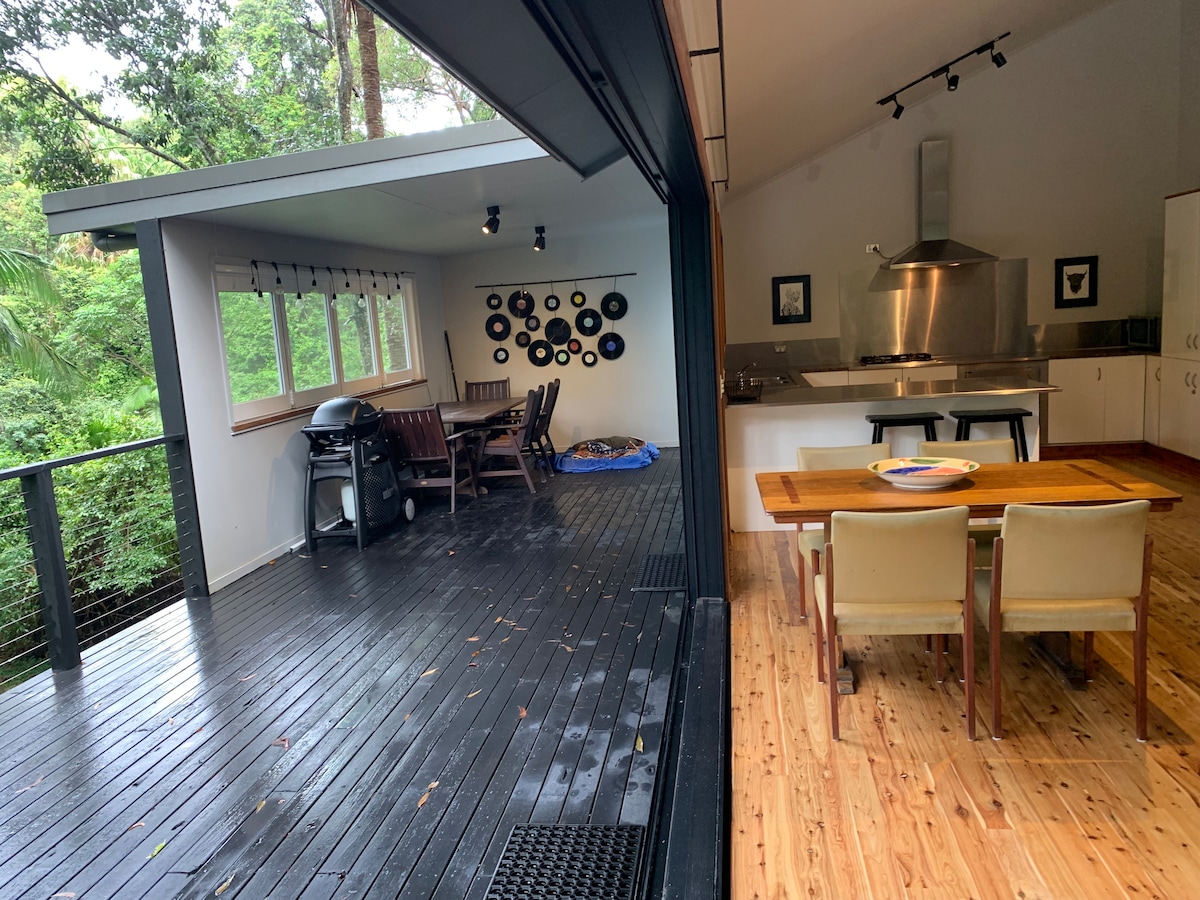 Chalé de 2 quartos aninhado dentro de uma floresta tropical. Plano aberto de nível dividido, tábuas polidas por toda parte, cozinha grande e bem equipada, banheiro principal com banheira e lavanderia moderna e toalete com segundo vaso sanitário. A sala de estar e a área de jantar se abrem através de dobras modernas para um grande deck traseiro que está posicionado de frente para a floresta tropical para maximizar a sensação de reclusão e privacidade.