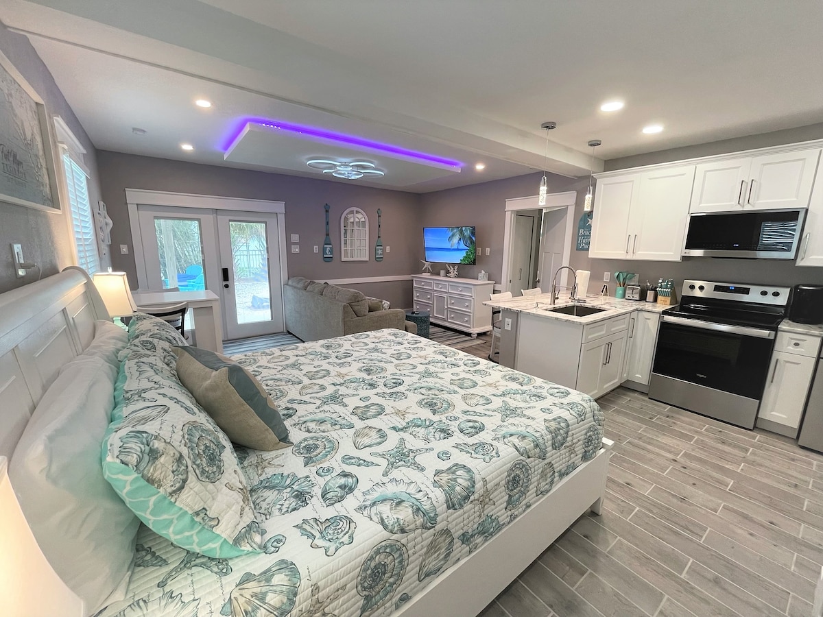 This vacation rental unit has been totally rebuilt and is now ready to welcome guests again! Nearly everything is new (as of early 2025) and it is likely one of the nicest studio apartments now available on the entire island. Skip the dated condos and hotels and get ready to enjoy this newer, nicer option, located just 1 short block (800 feet) from the sand. As you’ll see from the reviews it had a great track record before the storm, and it’s been rebuilt even better! Enjoy!