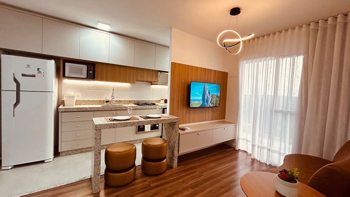 Apartamento novinho, moderno e totalmente mobiliado, com 2 quartos (1 suíte), ar-condicionado nos quartos e na sala, TVs smart, cozinha completa + churrasqueira. Localizado em uma das melhores regiões de Foz do Iguaçu, próximo à Av. das Cataratas, restaurantes, mercados e farmácias. Condomínio fechado com área comum de alto padrão, piscina, sauna, elevador e vaga de garagem. Um espaço pensado com carinho em cada detalhe para hóspedes que buscam conforto, segurança e uma experiência premium.