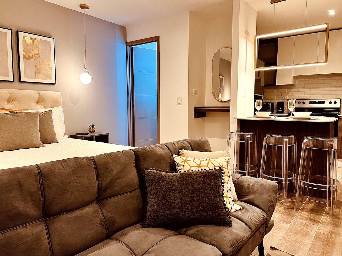 Apartamento loft inteiro. Tem um belo terraço, 1 quarto aberto com cama Queen e A/C, casa de banho privativa, sala de estar, sala de jantar e kitchenette totalmente equipada, máquina de lavar e secar roupa. Com Smart TV de 58 polegadas para entretenimento e Wi-Fi. Inclui 1 estacionamento gratuito no local.