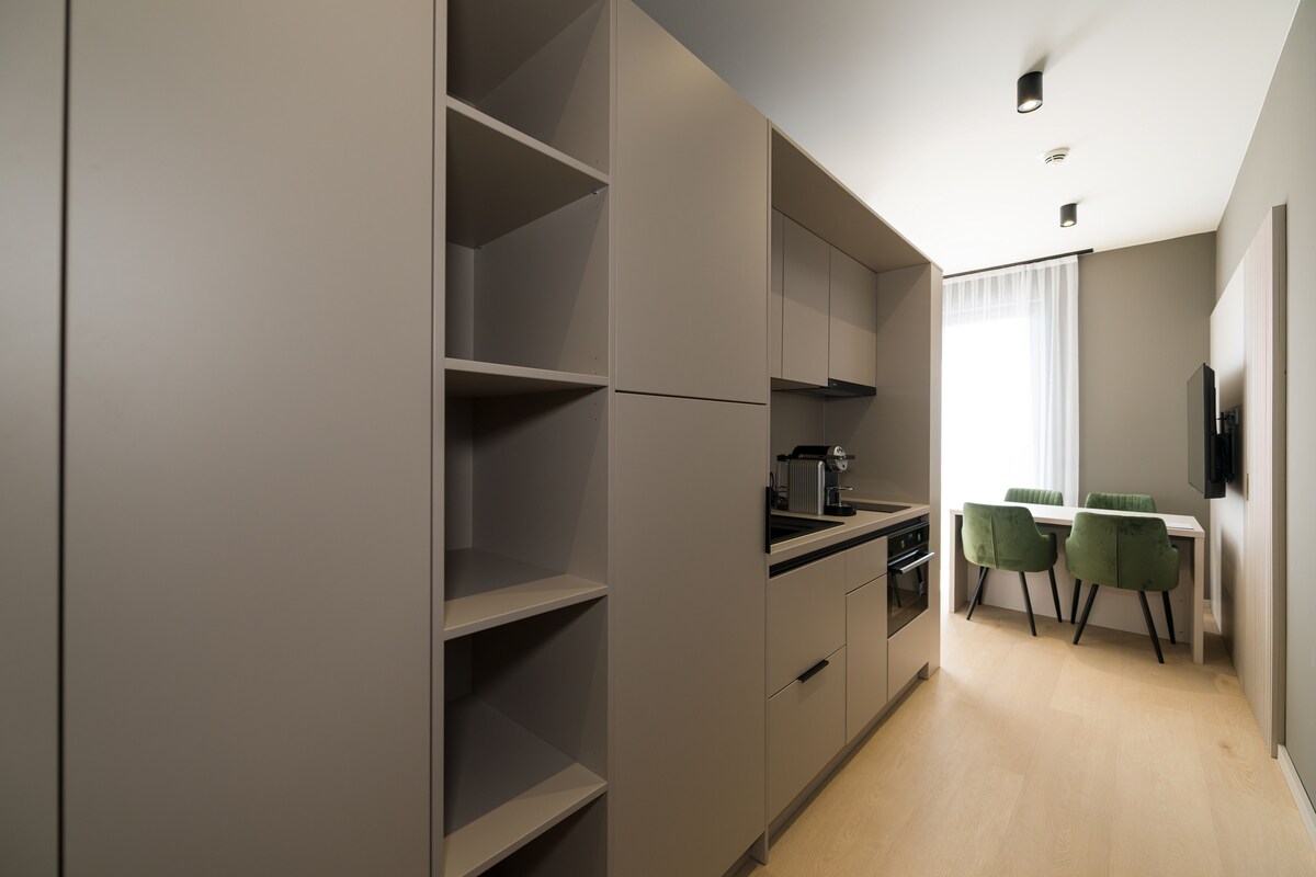 Estes estúdios são modernos e convidativos com o espaço para acomodar um solteiro ou casal. Os móveis contemporâneos complementam as texturas quentes do chão e do mobiliário. Desfrute da conveniência de ter uma cozinha totalmente equipada, casa de banho privativa e uma televisão de ecrã plano com canais por satélite.