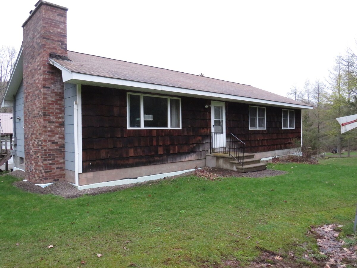 Hawkhill, um refúgio idílico e isolado. 2 quartos, camas queen. Wi-Fi de alta velocidade. Aquecimento elétrico, fogão a lenha. Desfrute do fogo e observe a vida selvagem. Fogueira. Grelha a propano. Acesso à entrada durante todo o ano. AWD melhor no inverno. Trilhos para o lago, riacho e uma pequena cascata. Oneonta a 20 minutos. Cooperstown a 45 minutos. Visite o encantador Franklin. Incrível deck de segundo andar que fica de frente para apenas bosques. Adequado para cães até 2 cães. Unidade de ar condicionado independente na sala principal em julho/agosto. Câmara virada para a entrada.