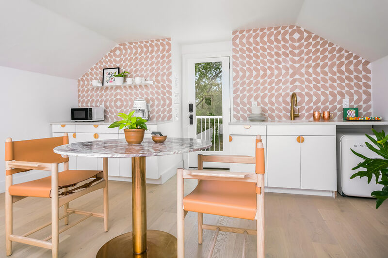 As comodidades da suite incluem todas as novas renovações modernas com acabamentos de designer de luxo, uma Samsung Frame TV, chuveiro de entrada, cama king size, cozinha completa, mini kitchenette e, o melhor de tudo, a localização mais invejável da cidade, a apenas 1 quarteirão do famoso distrito comercial histórico do centro comercial. Salas de degustação, lojas, restaurantes, bares e tudo o que Fredericksburg tem para oferecer, tudo a poucos passos da porta da frente! Abra o espumante! Reserve hoje!